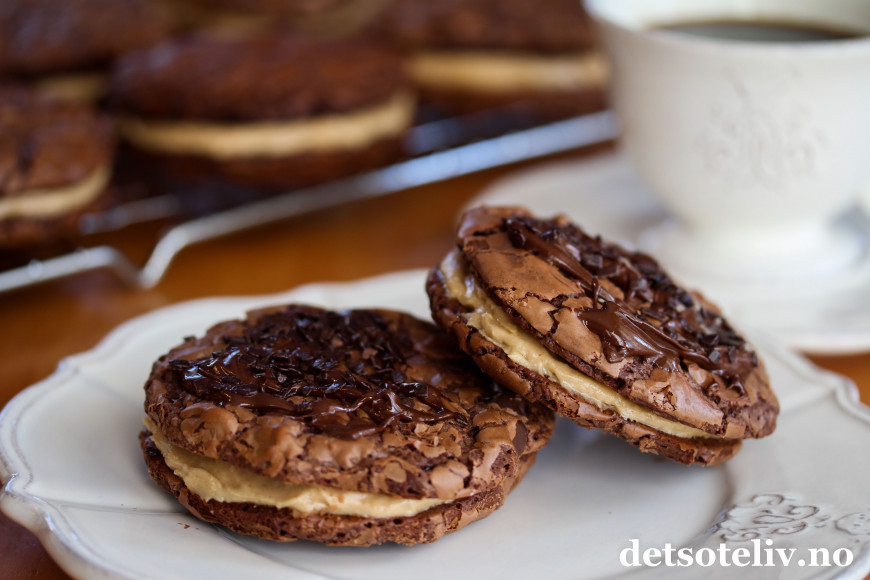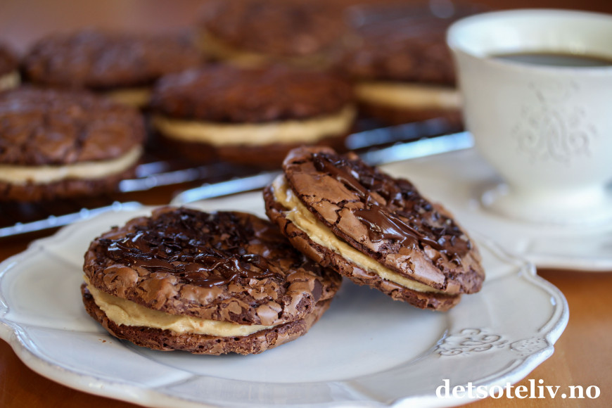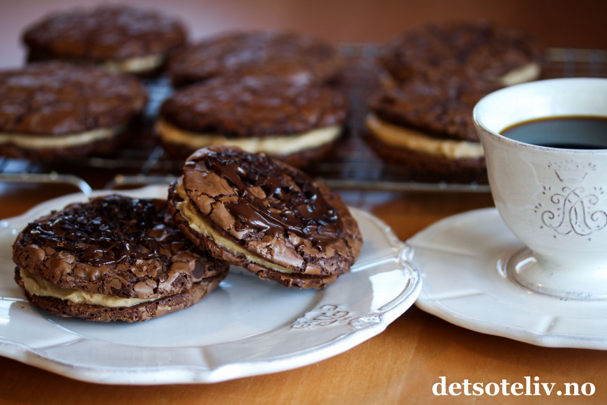 Sjokoladecookiesene er nydelige som de er, men legger du dem sammen to og to med et kremete peanøttfyll i mellom...