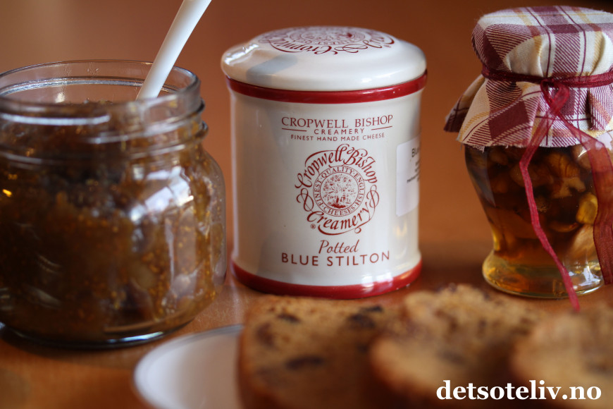 Jeg brukte fikenmarmeladen denne gangen sammen med Blue Stilton i krukke fra Cropwell Bishop (kjøpt hos Harrods i London, men jeg har også sett denne osten i norske ostedisker, blant annet hos Coop Mega).