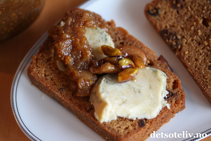 Jeg synes dette er supergodt på knekkebrød, men i helgen ble det ekstra luksus med nybakt Fikenkaken med kanel, som du finner her på Det søte liv.