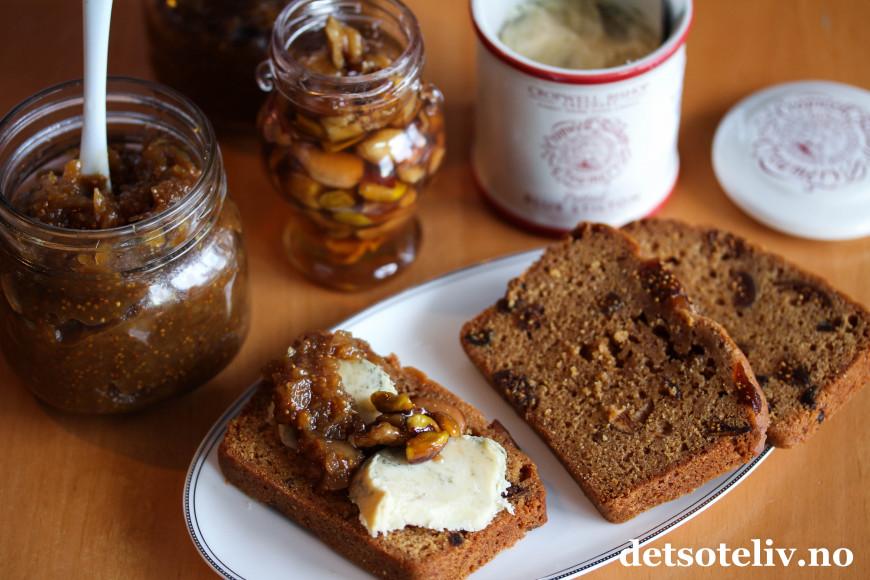 Jeg serverte marmeladen til den engelske osten Blue Stilton fra Cropwell Bishop (som er ekstra stilig siden den selges i krukke og som jeg har fått totalt dilla på for tiden..), nøtter i honning og nybakt Fikenkake med kanel....