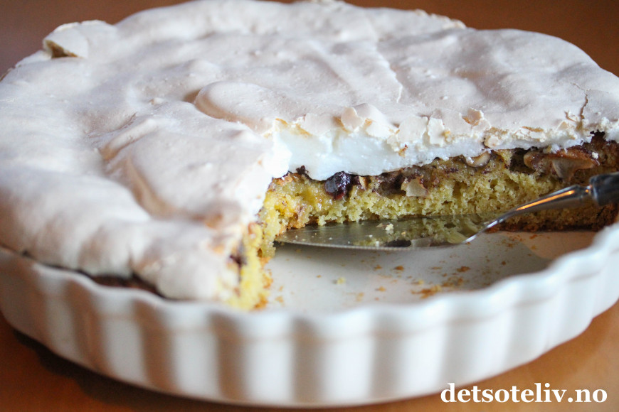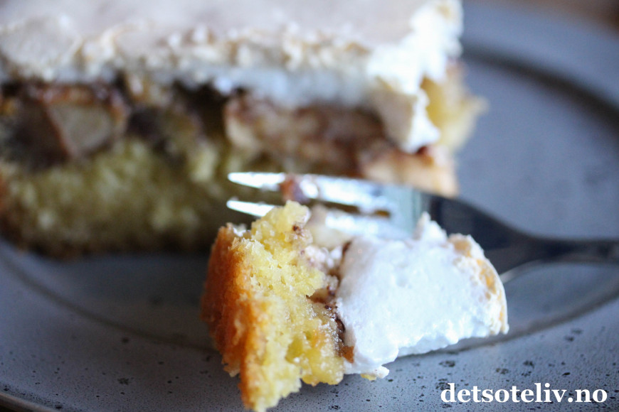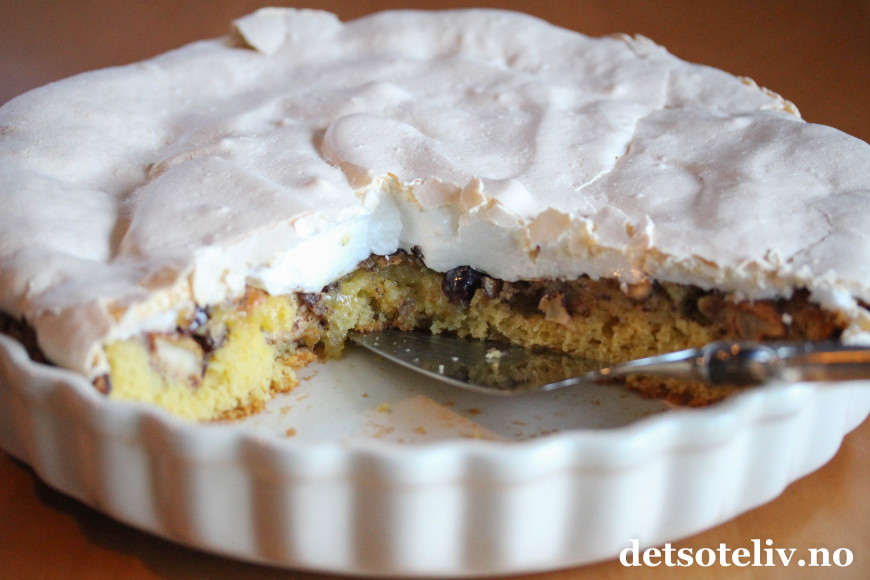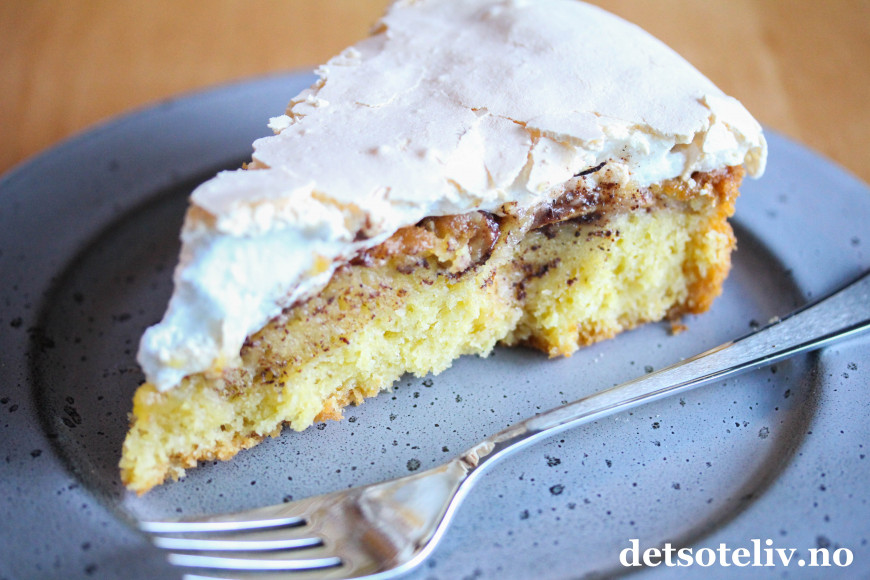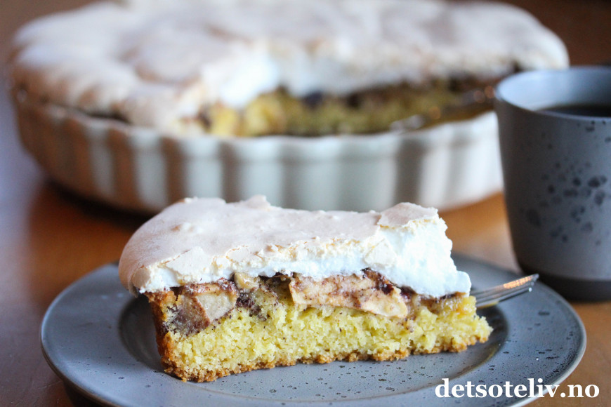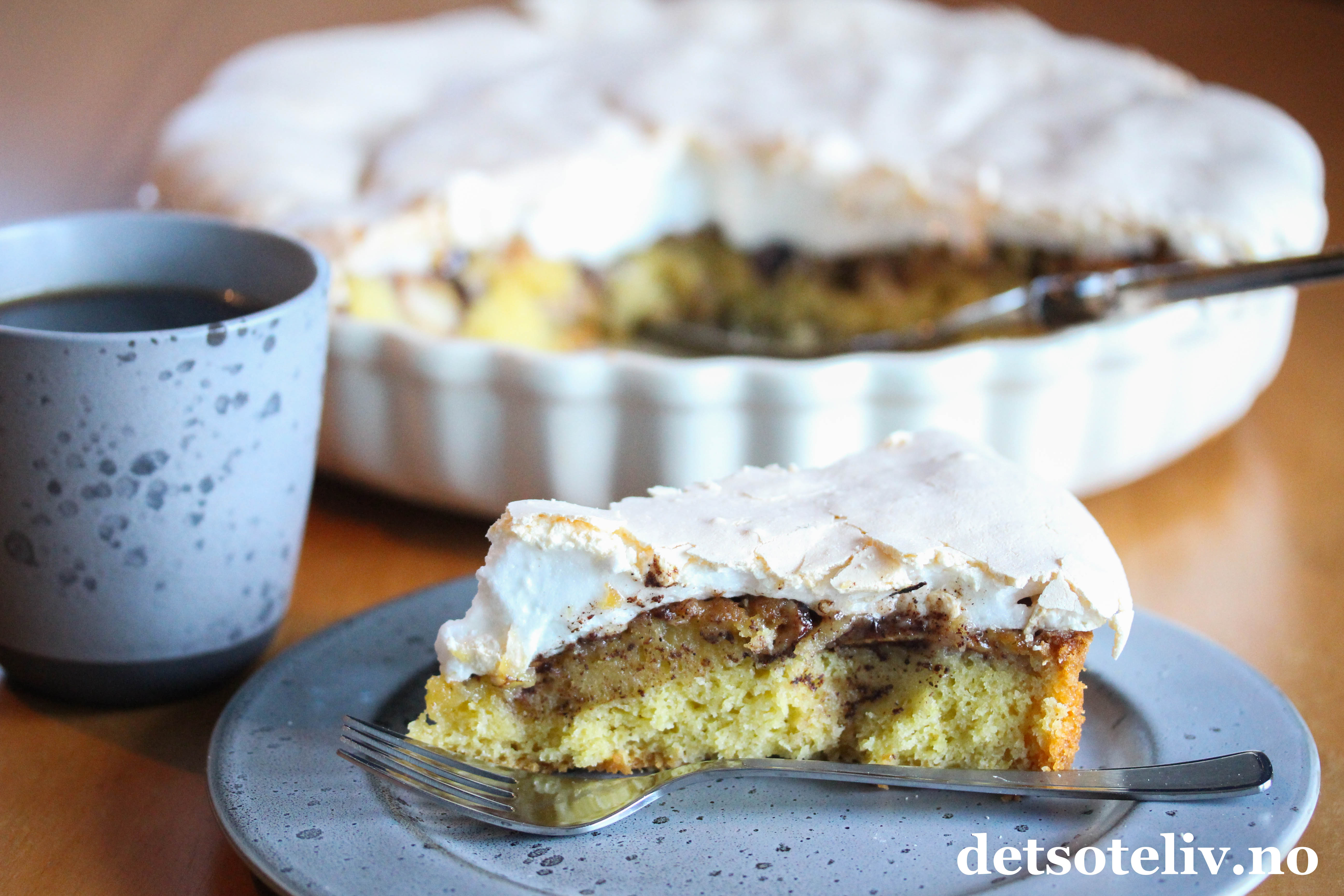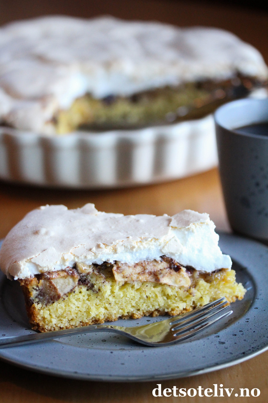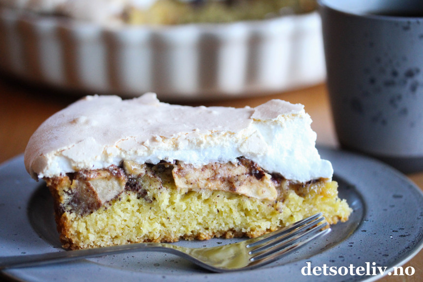 I tillegg til å være saftig eplekake med masse kanelkrydder i bunnen, får kaken ekstra god smak når man drysser grovt hakkede hasselnøtter over eplene og deretter dekker over med et tykt lag bløt marengs!