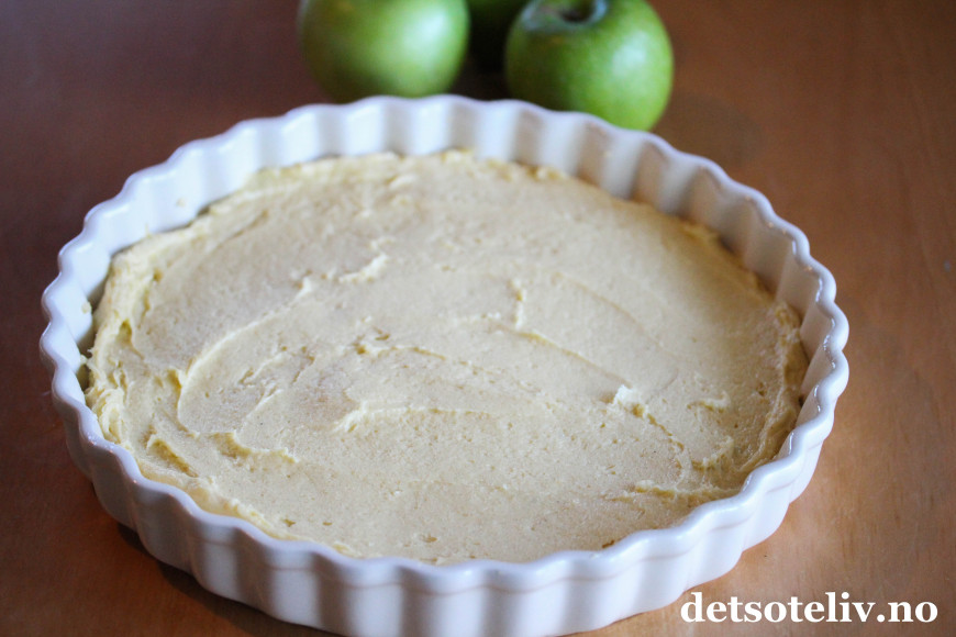 Fordel deigen utover i en stor rund, smurt form som er 28 cm i diameter. Jeg brukte som sagt en ildfast form, men rund springform (28 cm i diameter) kan også brukes. Alternativt kan man bruke liten langpanne som er ca 20 x 30 cm.