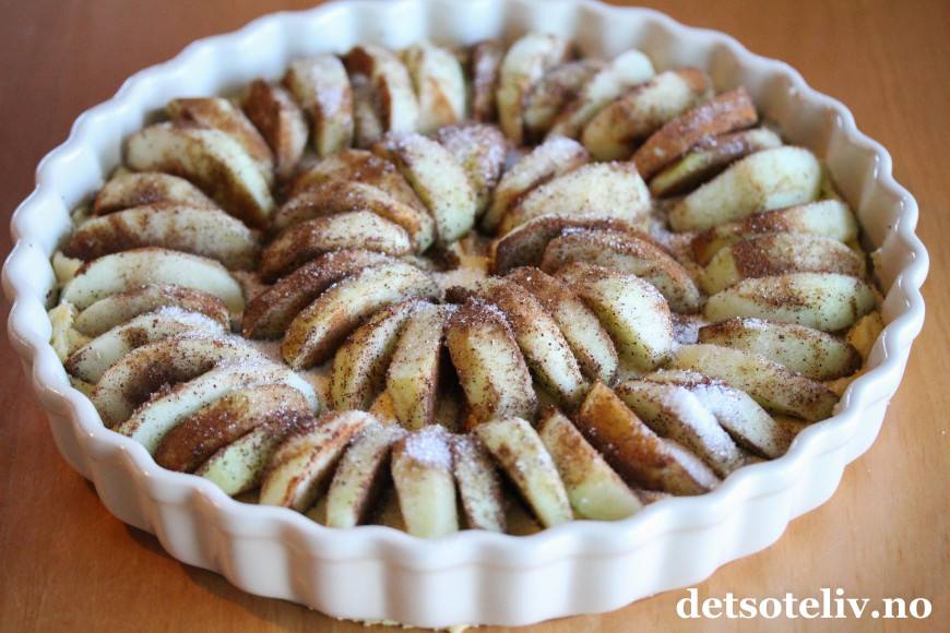 Skrell eplene og del dem i båter som så skjæres i tynne skiver. Vend eplene i en blanding av kanel og sukker og stikk epleskivene tett i tett ned i deigen i et pent mønster.