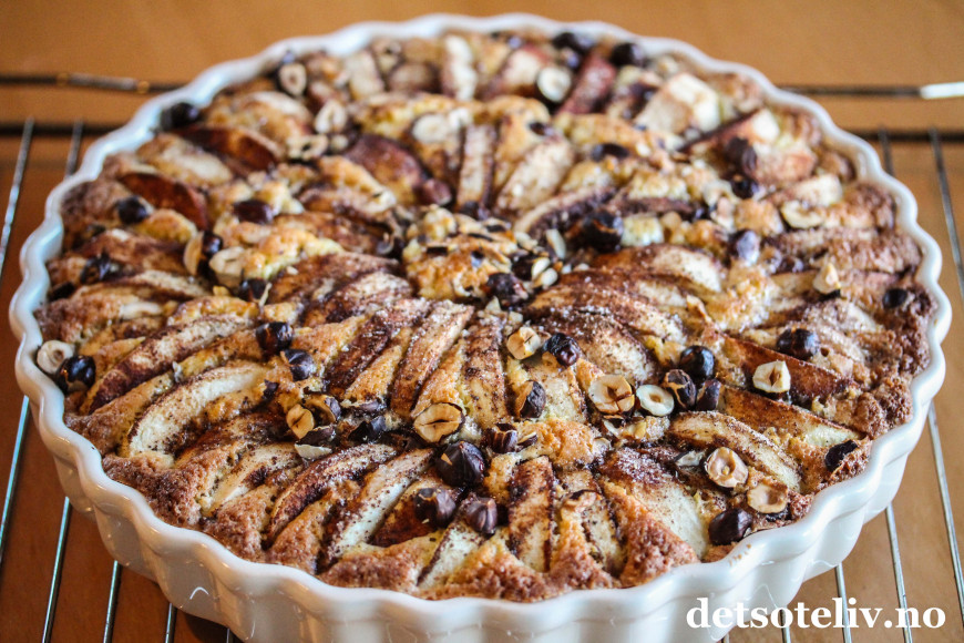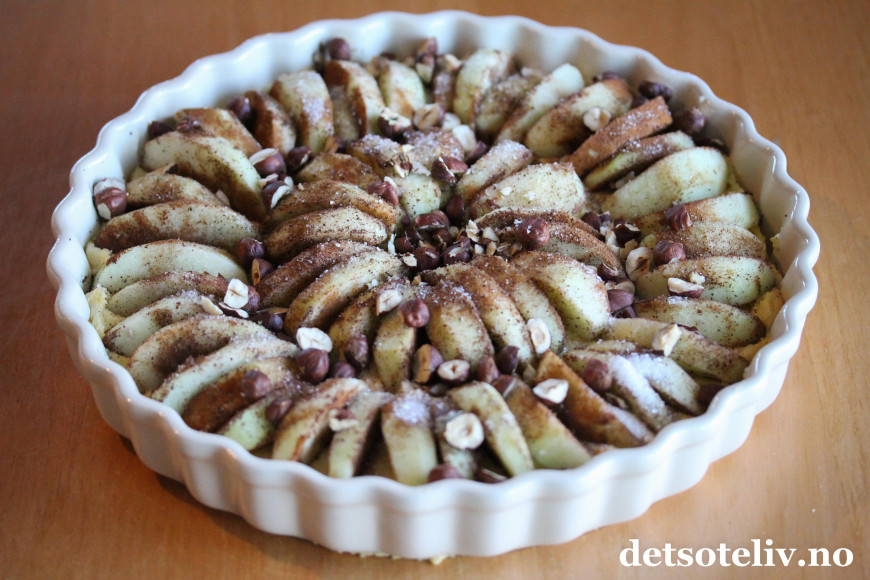 Skrell eplene og del dem i båter som så skjæres i tynne skiver. Vend eplene i en blanding av kanel og sukker og stikk epleskivene tett i tett ned i deigen i et pent mønster. Strø over litt mer kanel og grovt hakkede hasselnøtter.