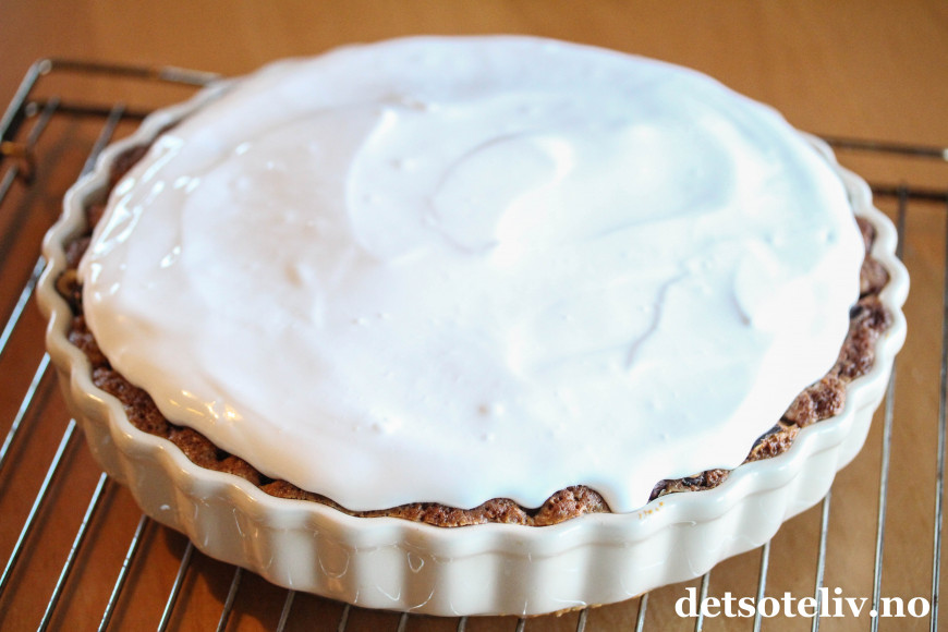 Sett kaken tilbake midt i ovnen og sted den videre i ca 10-15 minutter til. Marengsen skal bli lys gyllen på toppen og sjekk at kaken har blitt gjennomstekt i midten.