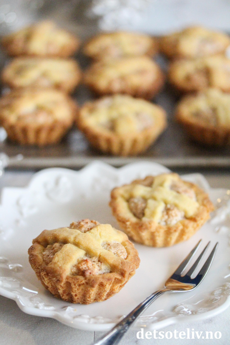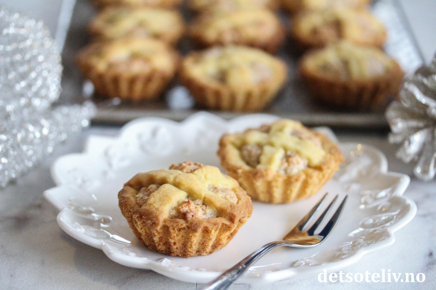 Fyll formene med mandelfyll. Kjevle ut resten av deigen og skjær ut tynne remser med bakkelsspore som legges i kryss over fyllet.