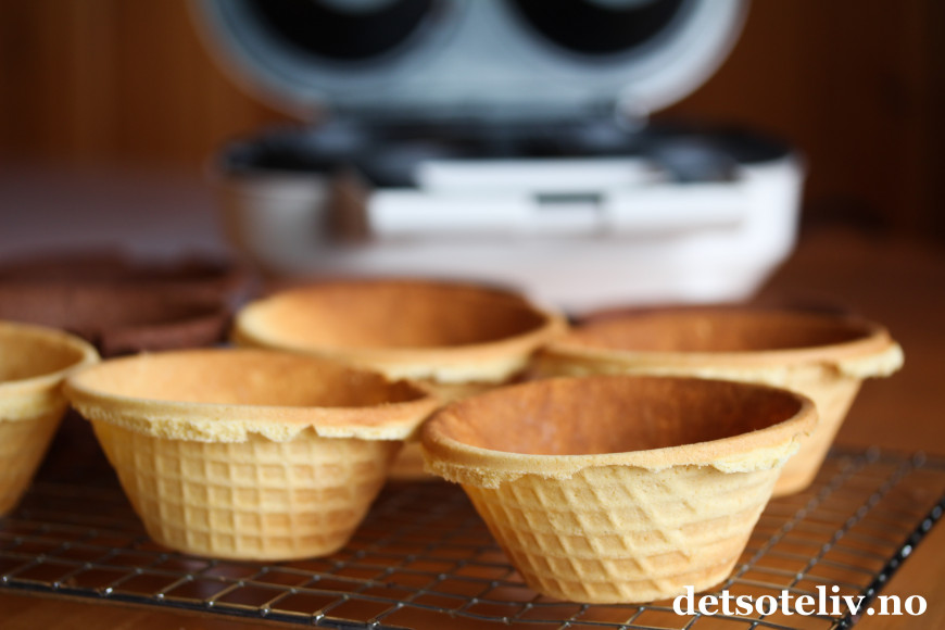 ♥ De ferdigstekte skålene er myke når de er varme, men blir nokså raskt forvandlet til sprø vaffelkjeks. Hvis du vil renskjære kantene rundt skålene med en saks, er det derfor viktig at du gjør det med en eneste gang etter at skålene er tatt ut av jernet. Venter du for lenge, blir kjeksen sprø, og går i stykker når du klipper langsmed kanten.