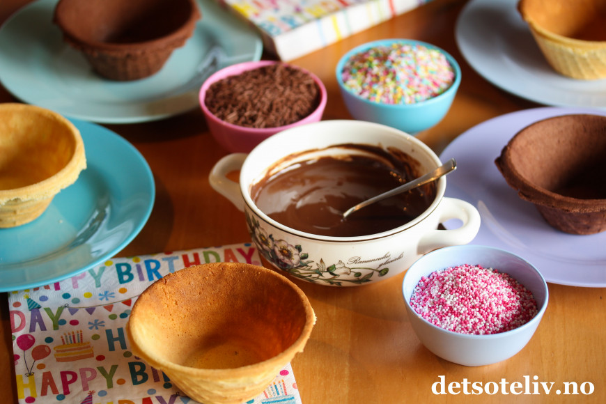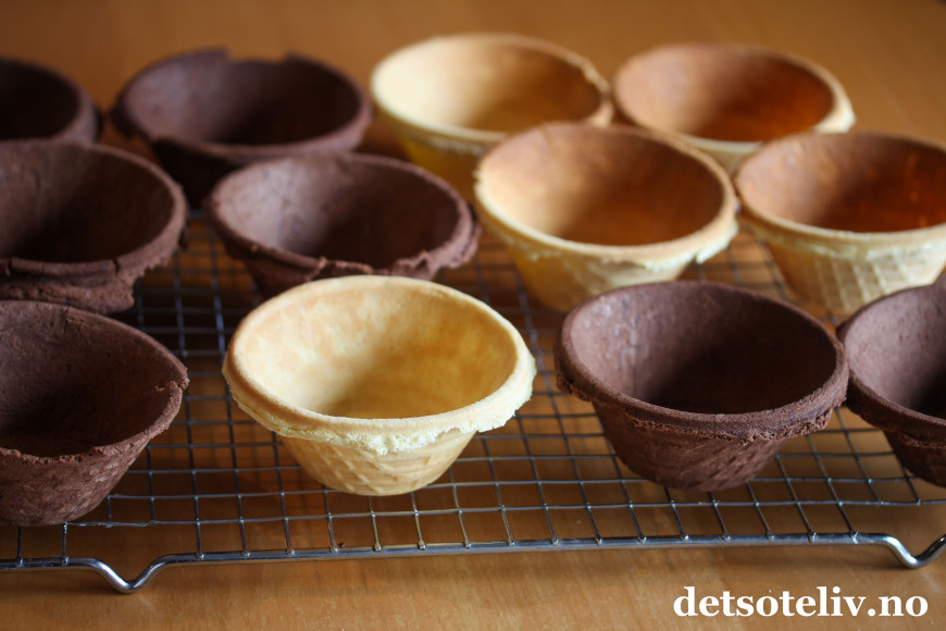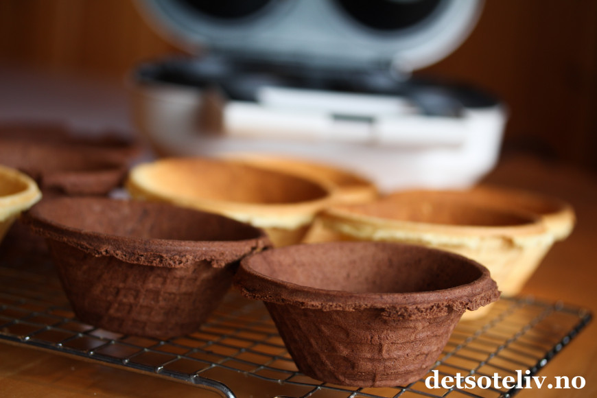 Jeg stekte ferdig vaffelskåler med vanilje og sjokoladesmak kvelden før selskapet.