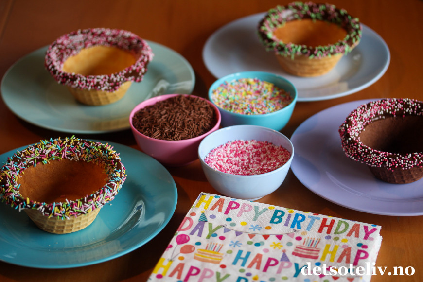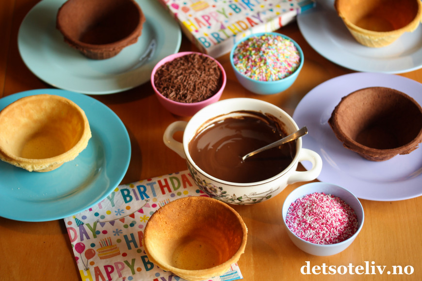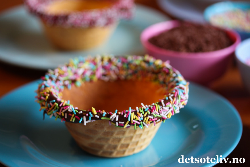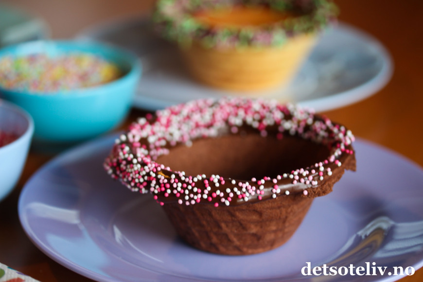 For å pynte kantene på vaffelskålene, smeltes sjokolade i skåler (dette går på et par minutter i mikroen). Dypp vaffelskålene i den smeltede sjokoladen og dryss på kakestrøssel.