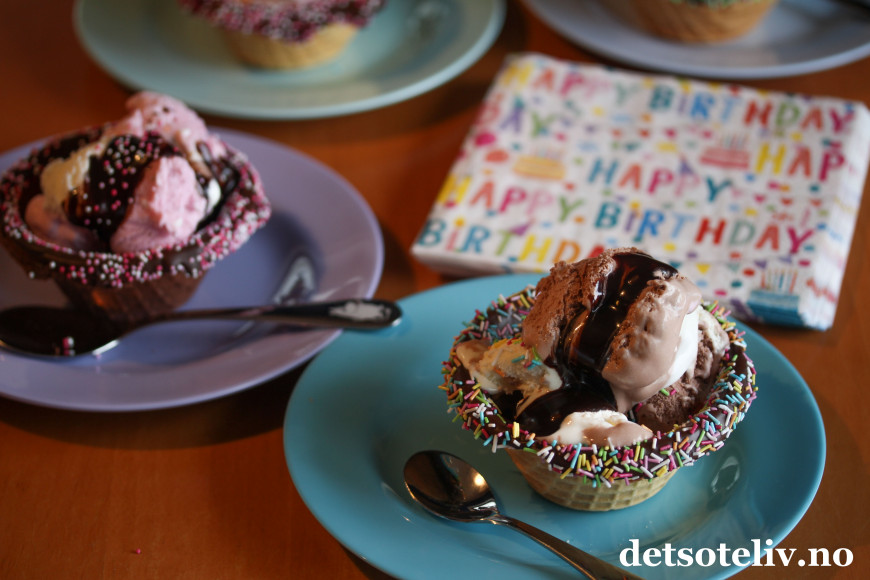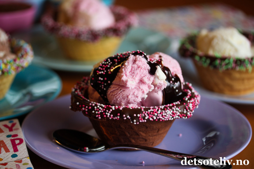 Deretter kunne de fylle skålene med iskrem og sjokoladesaus. Gjett om de koste seg!