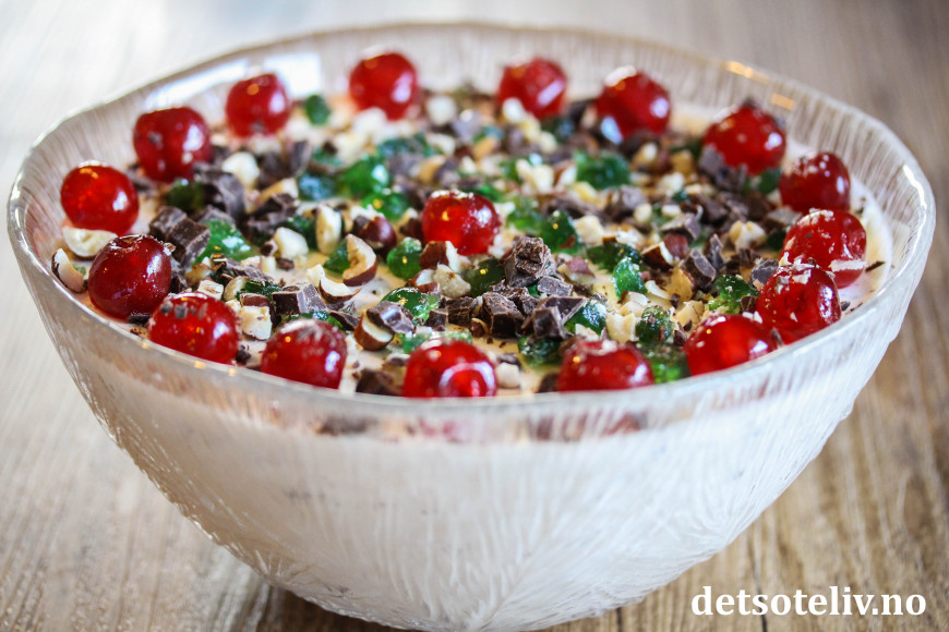 Pisk kremfløten til krem og vend inn i blandingen. Bruk en stålvisp (ballongvis) til å røre, så hvite kremklumper fjernes raskt. Vend til slutt i fint hakkede nøtter, cocktailbær og sjokolade.