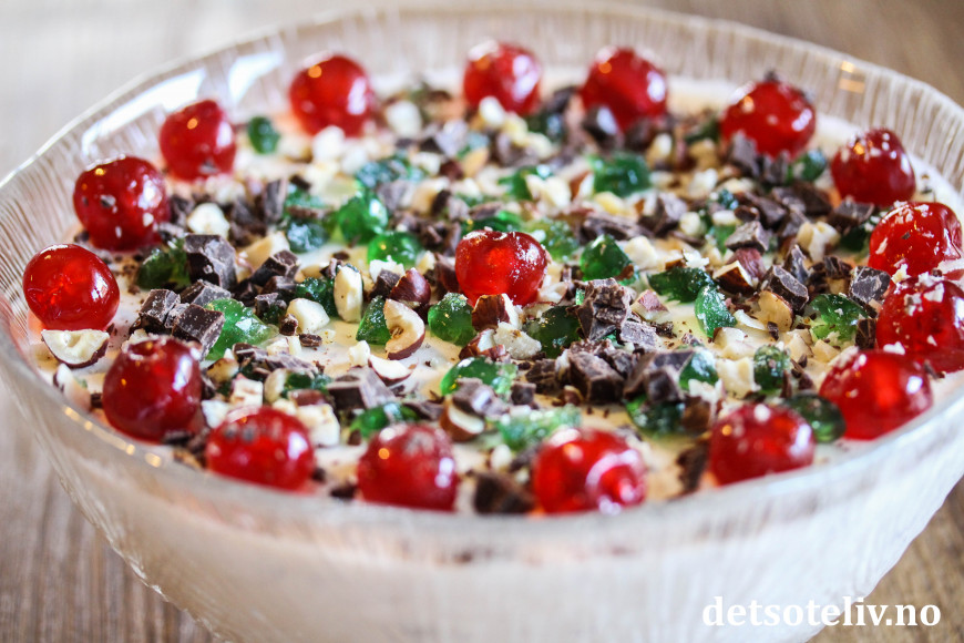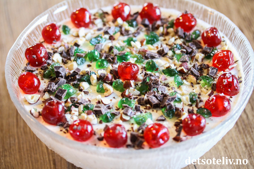Når fromasjen har stivnet, kan du pynte på toppen med mer nøtter, cocktailbær og sjokolade.