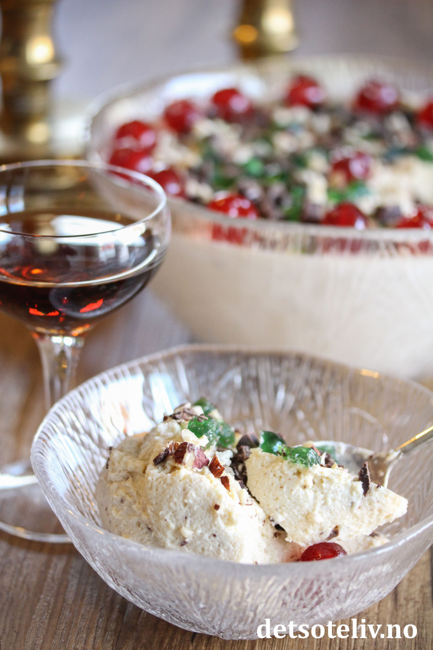 "En himmeriks munnfull" er således en luksuriøs eggedosisfromasj som smaksettes med sherry og rikelige mengder mandler, cocktailbær og sjokolade.