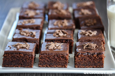 Bre glasuren over den kalde kaken med en smørekniv. Del kaken opp i passe store firkanter. Pynt hvert kakestykke med litt finhakket melkesjokolade.