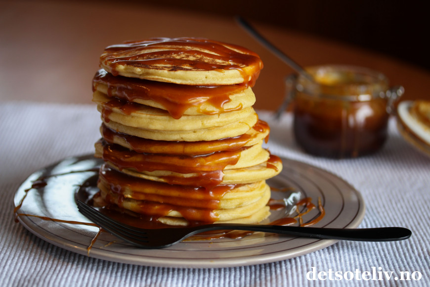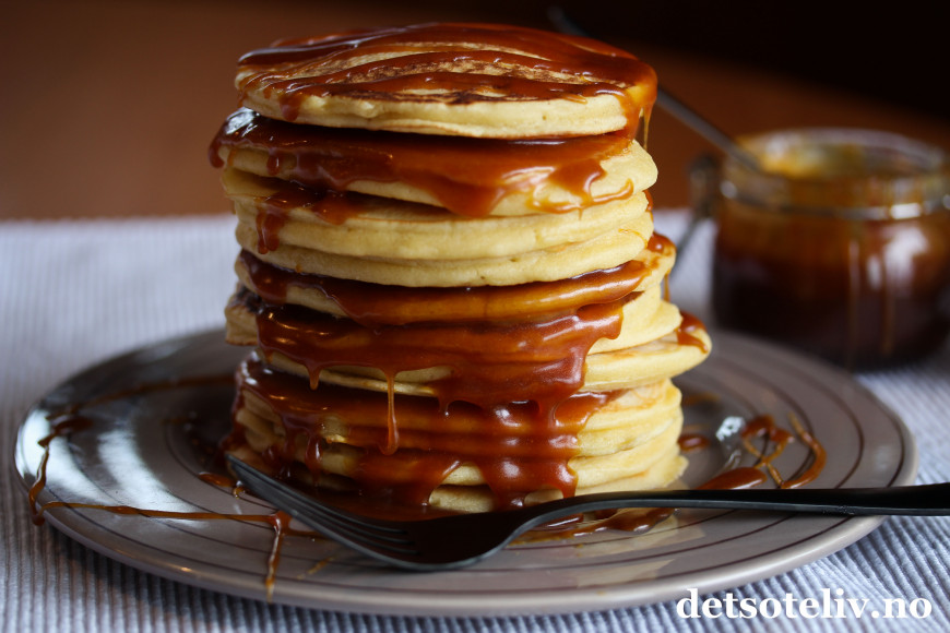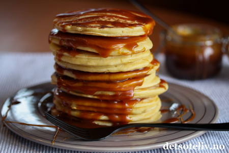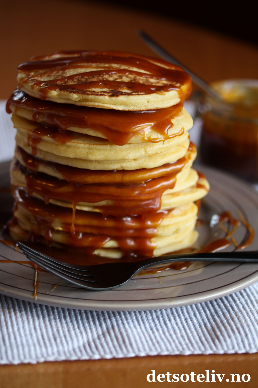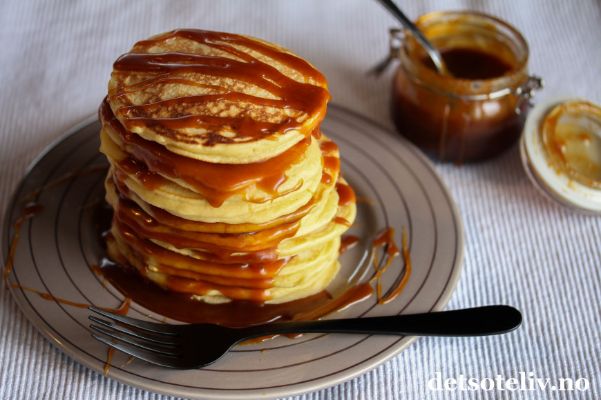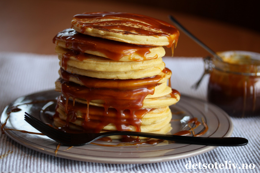 Fantastisk gode pannekaker og karamellsaus :D Jeg serverer disse med kandisert bacon. Bedre frokost finnes ikke :)