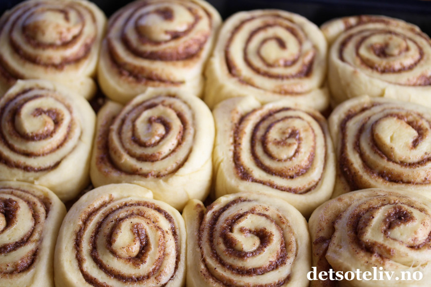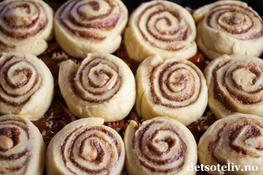 ♥ Lag bollene nokså tykke og tilpass steketiden. Det er ikke så høy varme for å unngå at karamellen skal få brent smak, så til gjengjeld må bollene steke nokså lenge. Det er viktig at bollene blir helt gjennomstekte.