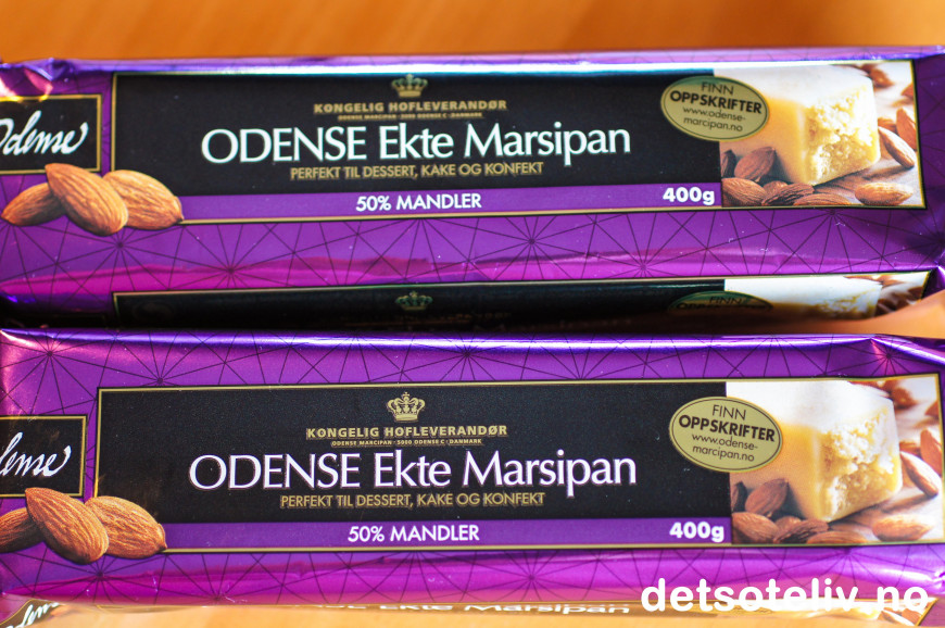 ♥ Ekte marsipan er marsipan med høyt mandelinnhold og ekstra god smak og fås kjøpt i de fleste butikker (lilla rull fra Odense).