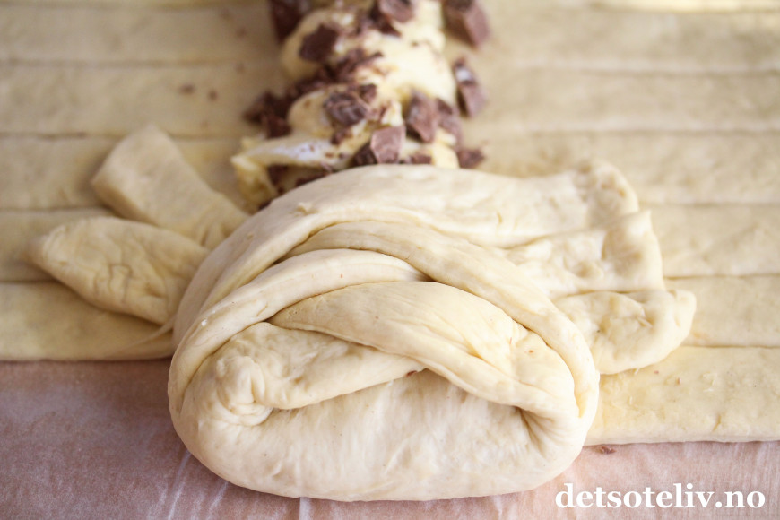 Den øverste lengden bretter du nedover (både midten og stripene på sidene) slik at fyllet pakkes godt inn med deig også på enden.