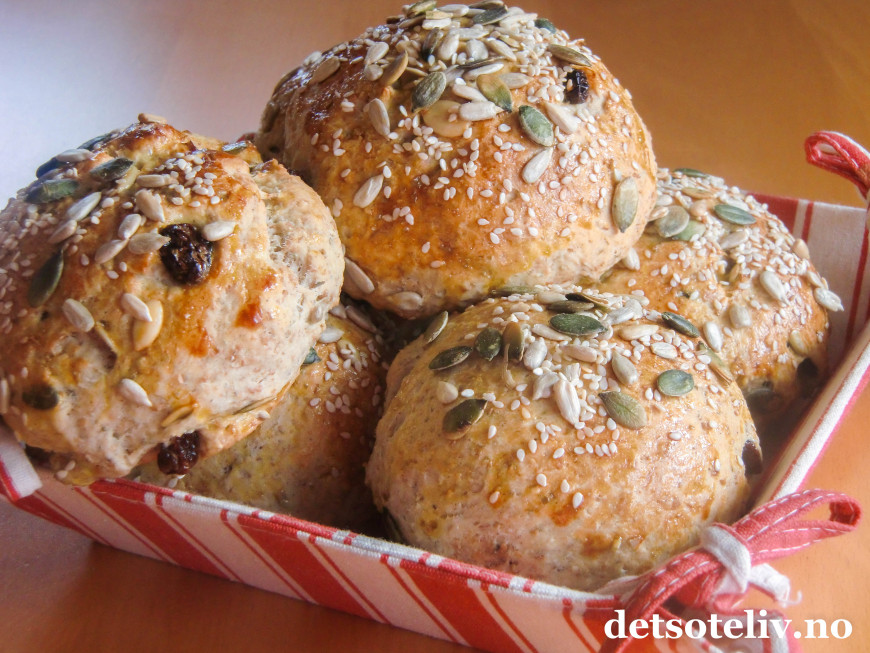 Smuldre gjæren i en bolle. Smelt smøret i en kjele. Tilsett melken og varm opp til smørmelken er lunken (37°C). Løs opp gjæren i væsken. Tilsett så sukker, kardemomme, rosiner, solsikkekjerner og gresskarkjerner og deretter det grove melet til en jevn deig. Deigen kan virke litt klissete, men la den bare være slik, dette bedrer seg etter hevingen. La deigen heve lunt i godt og vel en time.