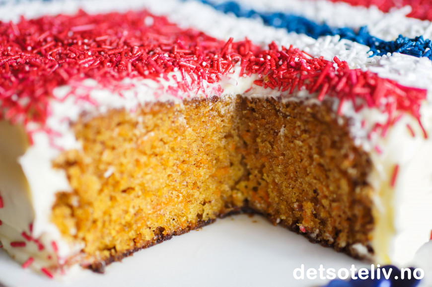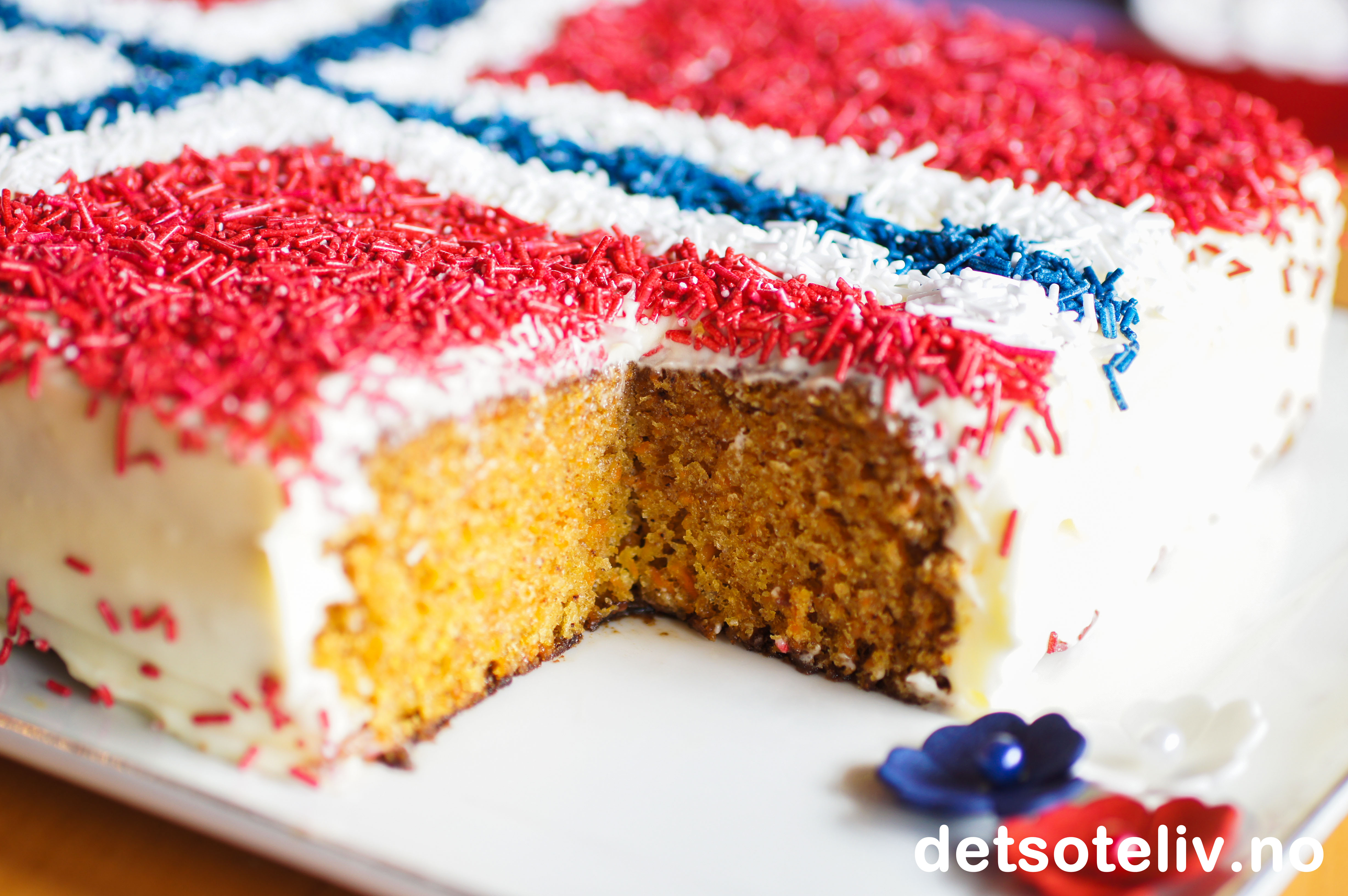 En gulrotkake som er dekket med hvit ostekrem egner seg utmerket som 17. mai kake!