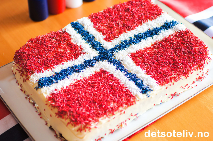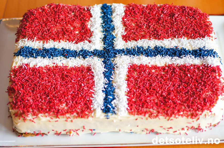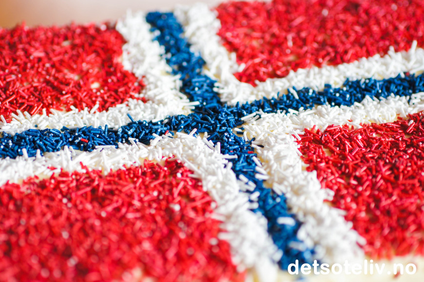 Steker du kaken i liten langpanne, får du perfekt fasong for å lage et flagg. Flaggmønsteret lager du enkelt med kakestrøssel i rødt, hvitt og blått.