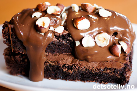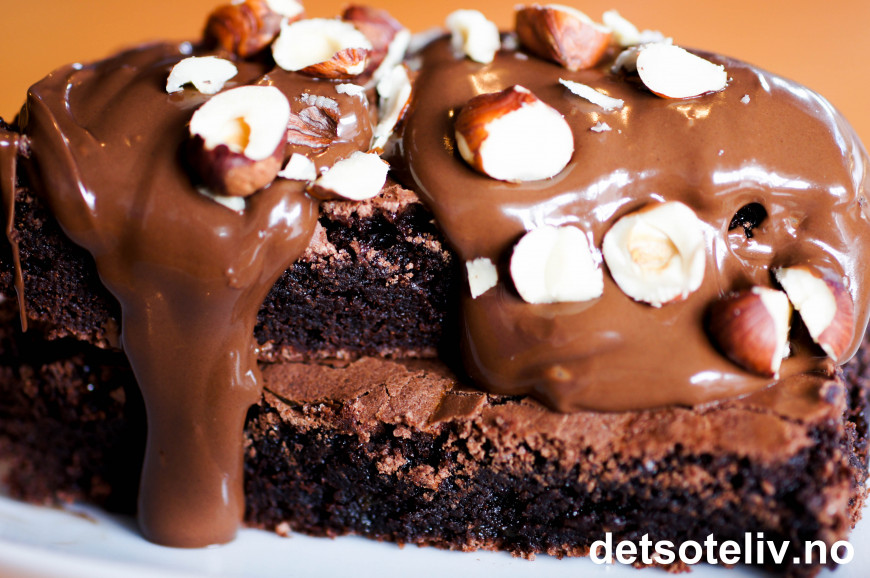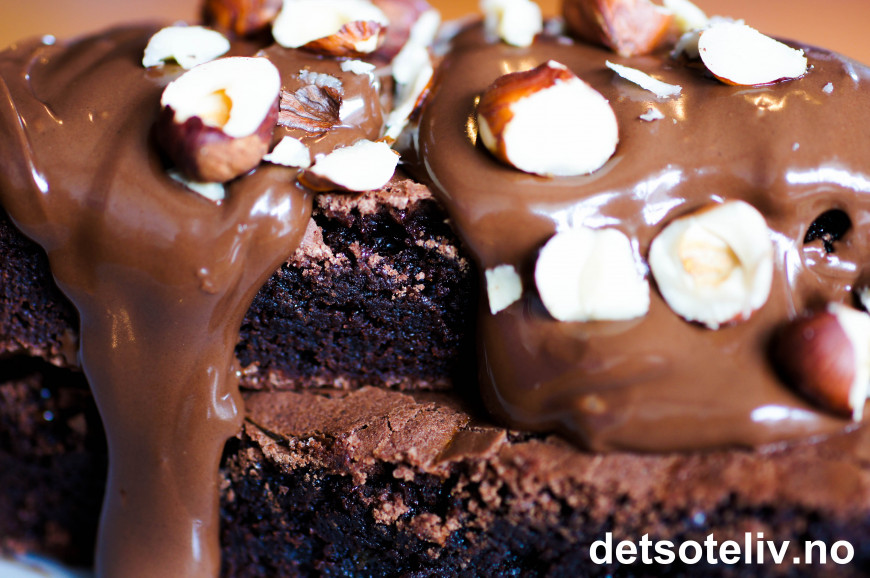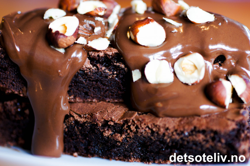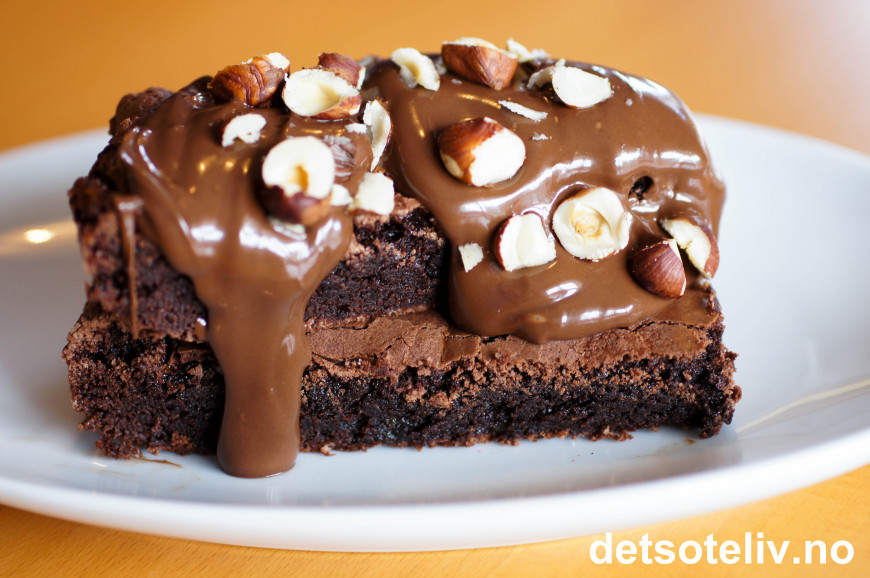 To brownies legges deretter oppå hverandre, og så pyntes det på en uanstendig måte med rennende, varm Nutella og grovt hakkede hasselnøtter...