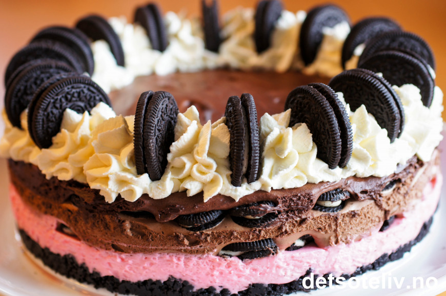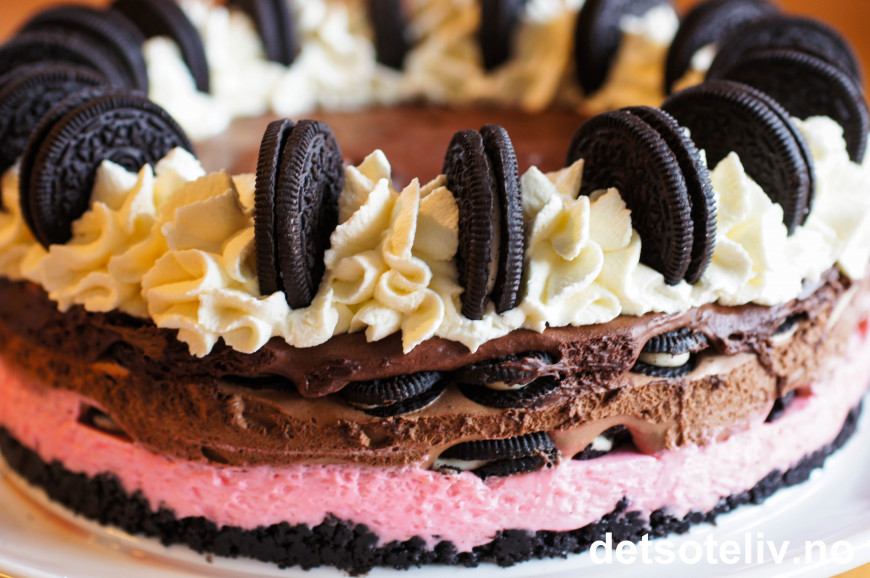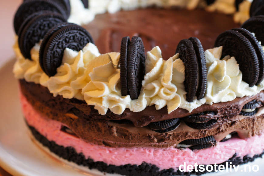 Kaken oppbevares kjølig frem til servering. Se også "Oreokake (Oreo Dream Cake)" og "Oreo Cake Original" her på www.detsoteliv.no.