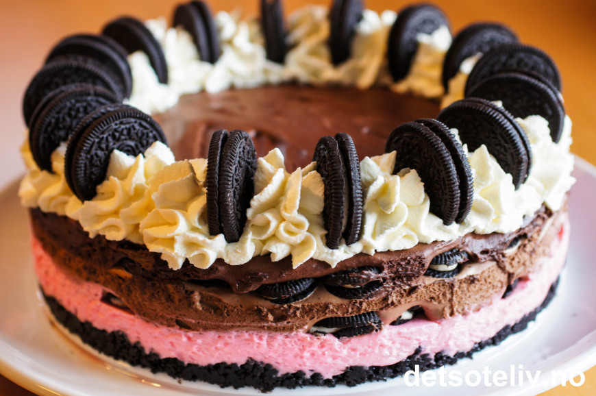 Jeg har dessuten laget denne kaken et par hakk mer luksuriøs enn det som er vanlig med Oreokake ved å ha både Oreokjeksbunn, kremostfyll (her farget rosa), lys sjokolademousse med Oreobiter, og så en mørk sjokolademousse med Oreobiter, og deretter pisket krem og Oreokjeks til pynt!