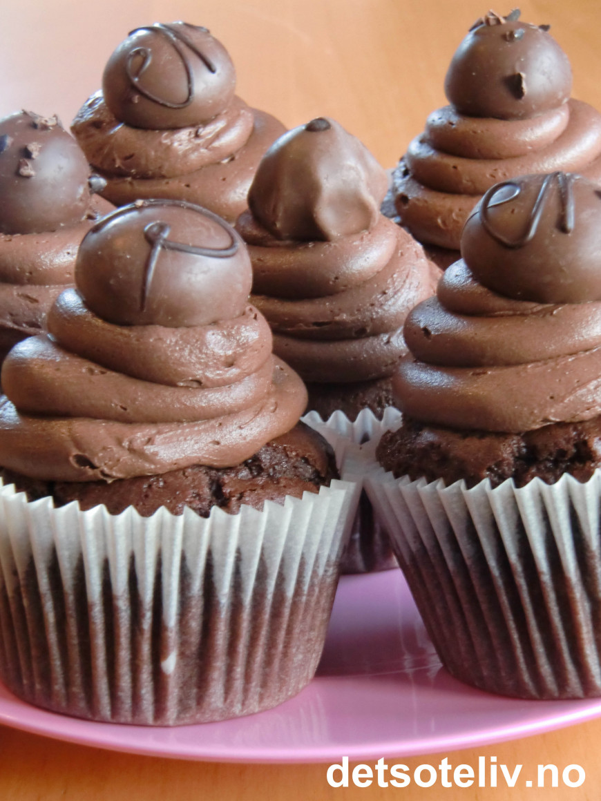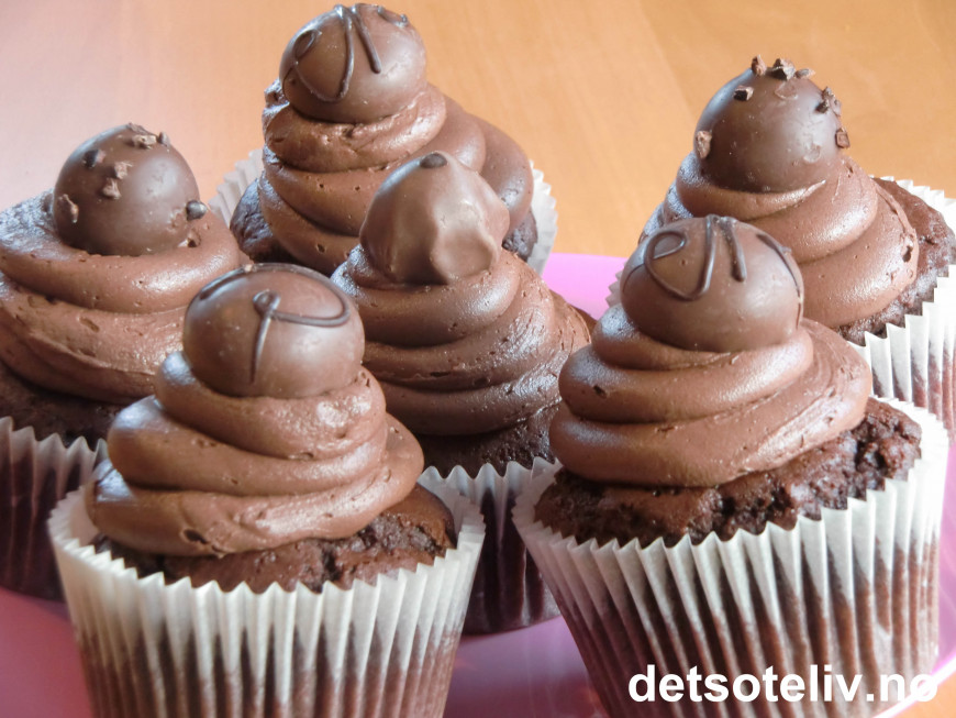 Pisk sammen ingrediensene til sjokoladekremen til den er jevn, blank og fluffy (bruk bare 1 ss Baileys i første omgang og se om du trenger litt mer for å passe konsistens). Ha sjokoladekremen i en sprøytepose med glatt, rund tut og sprøyt lekre topper på hver av de avkjølte muffinsene.