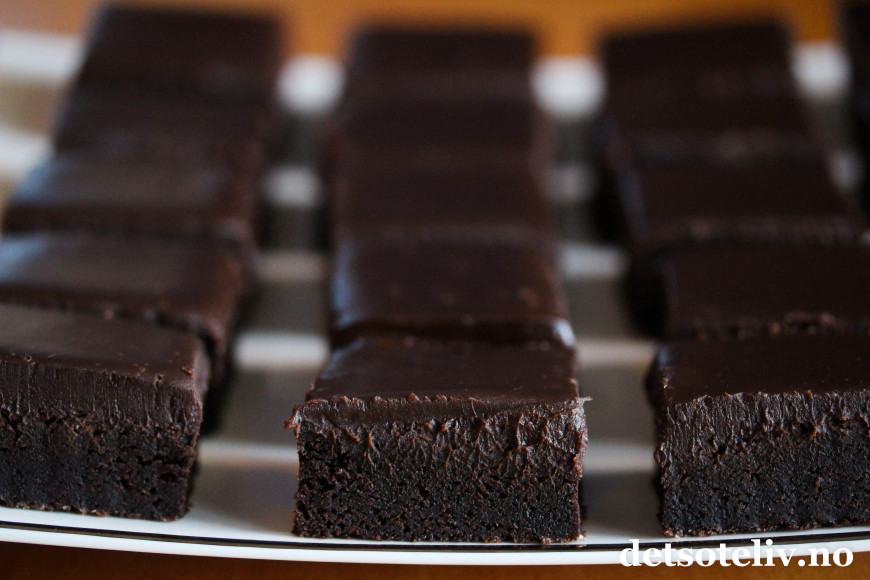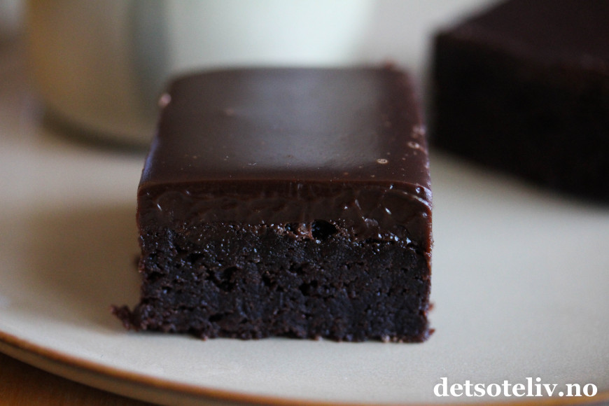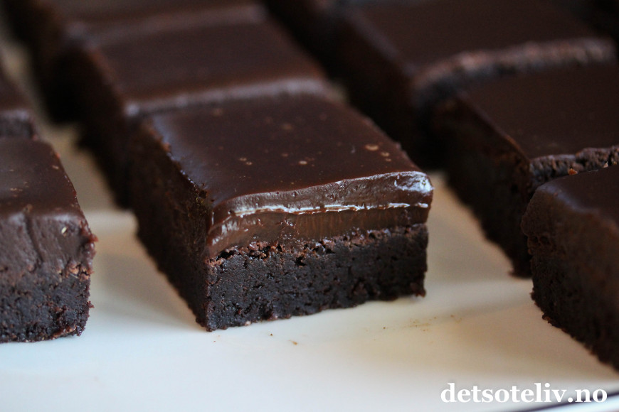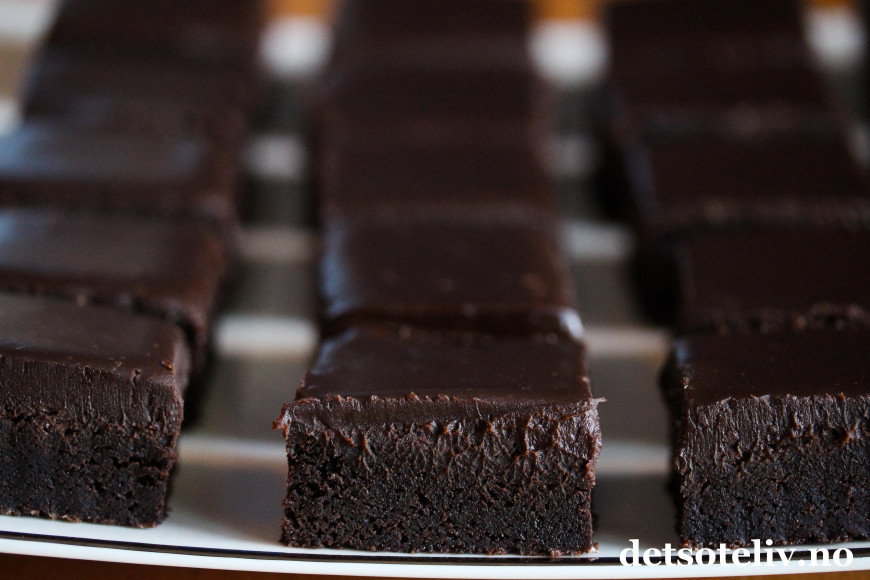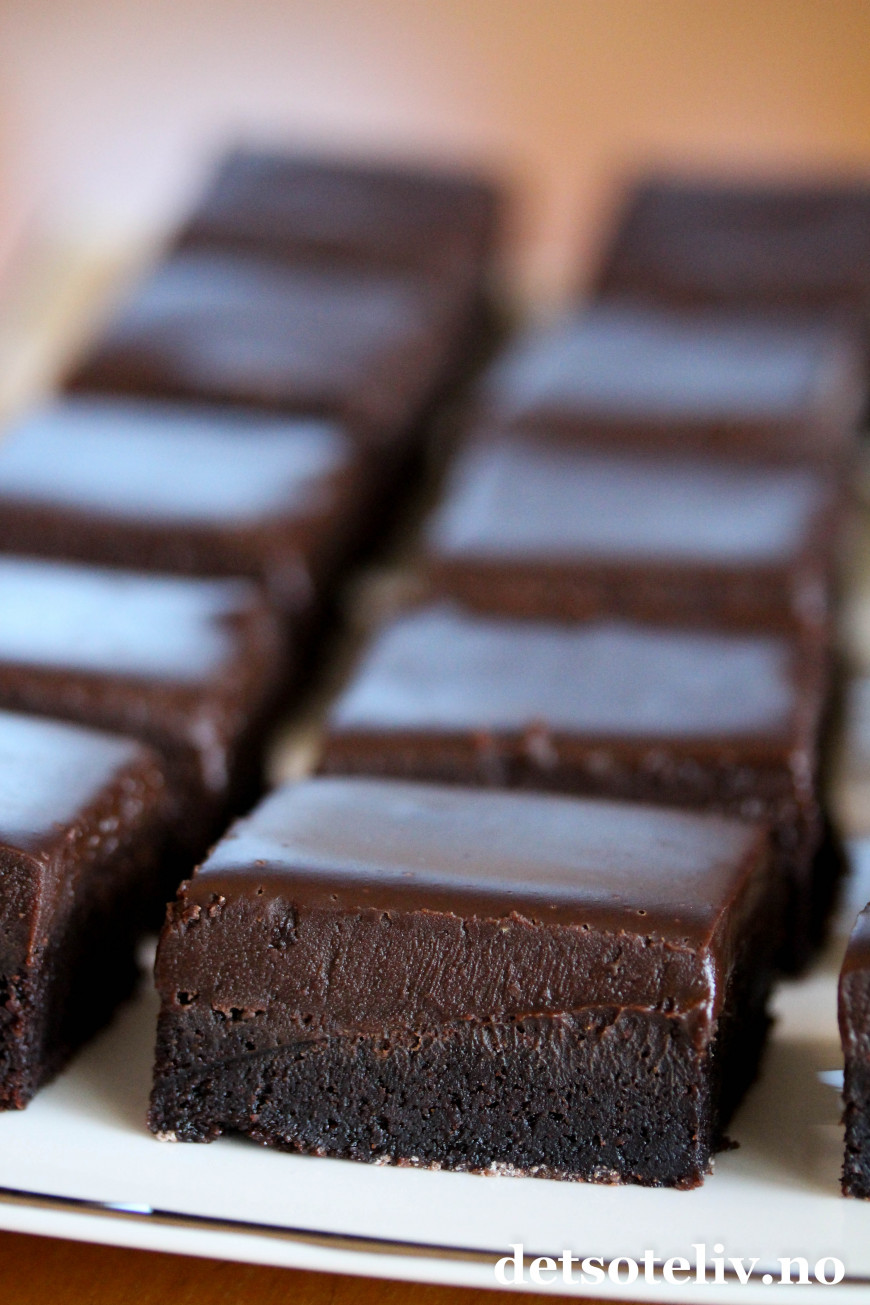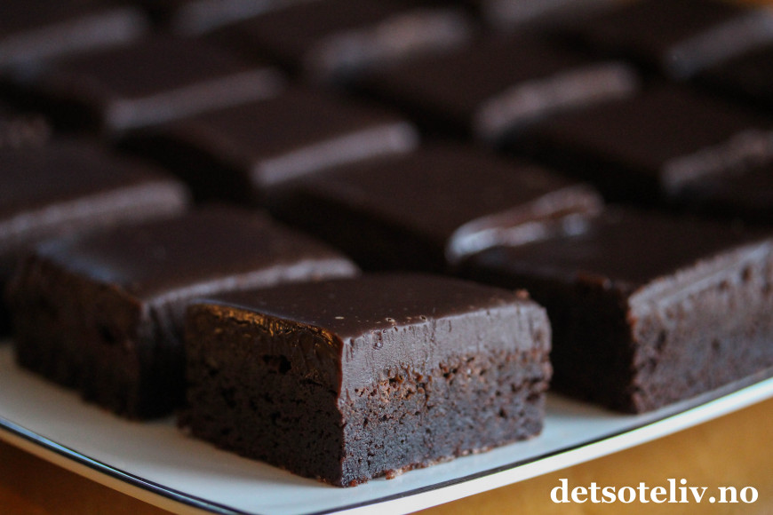 Her kommer oppskriften som også har vært på trykk i min spalte i VG søndagsavis og på godt.no i dag, nemlig SUPERDIGGE, seige sjokoladebrownies med et tykt lag sjokoladeglasur.
