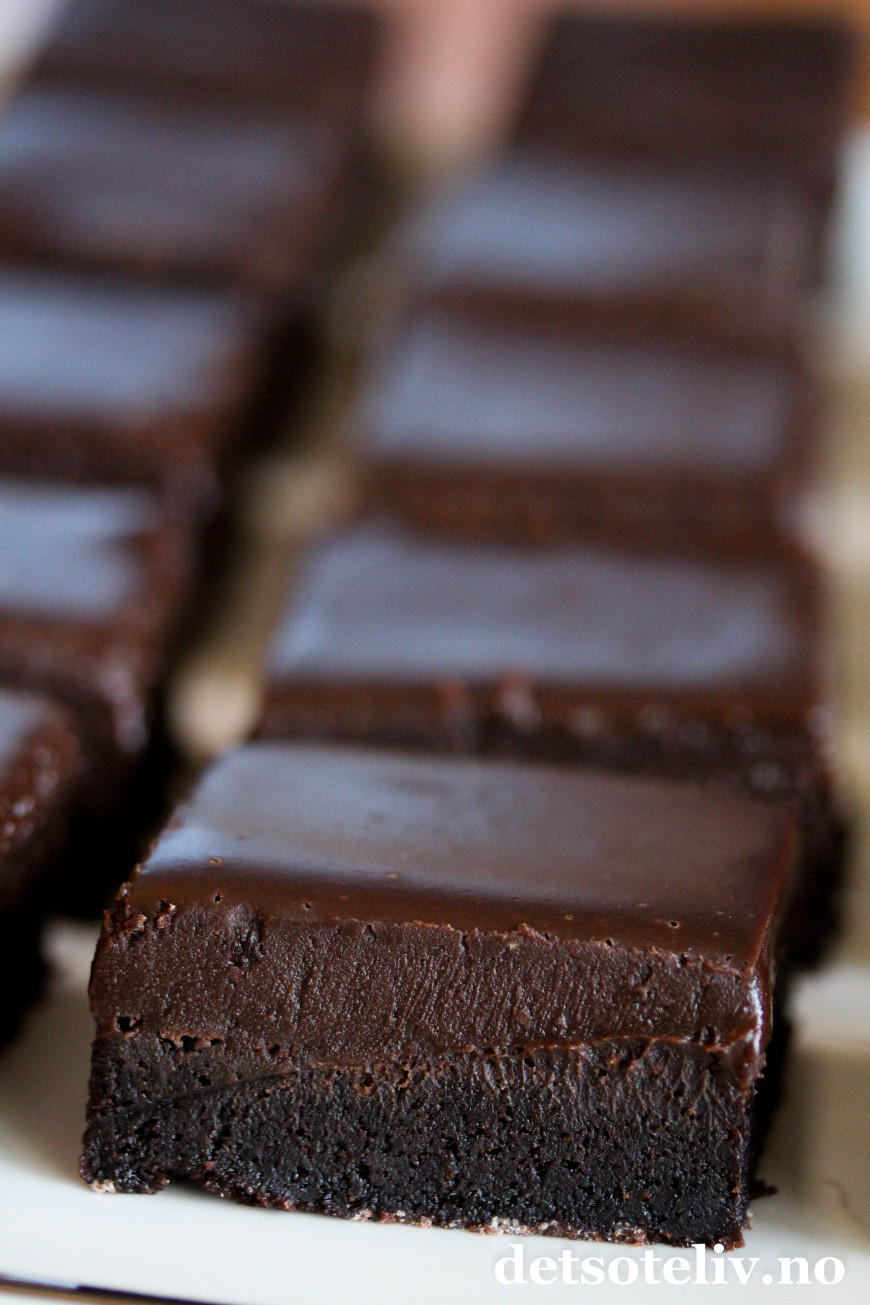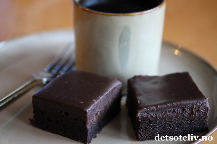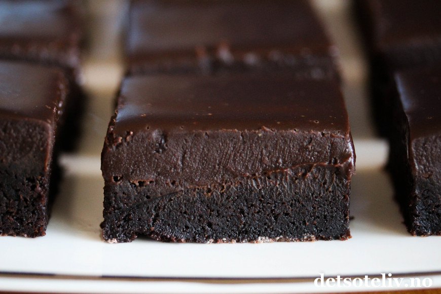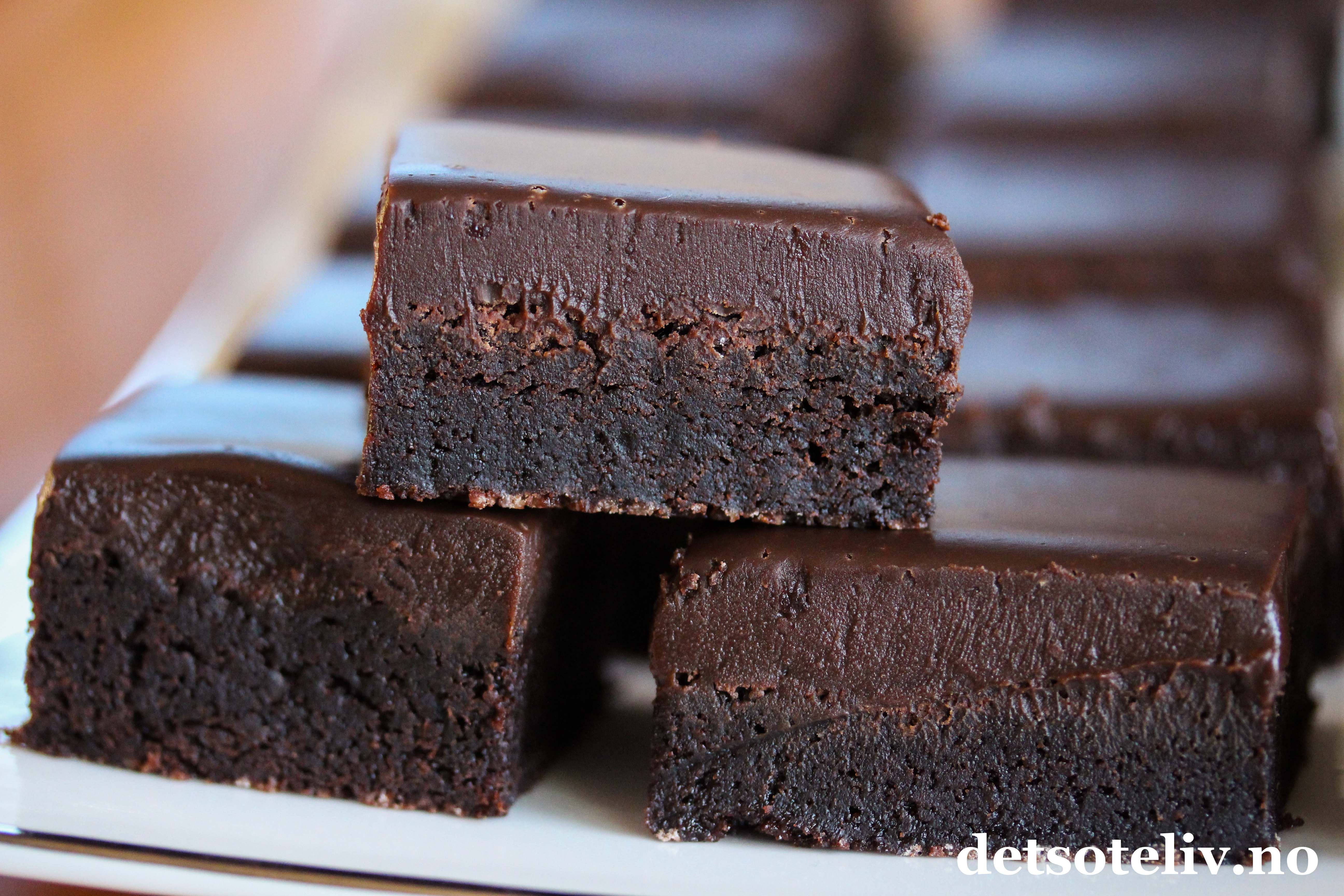 Her kommer oppskriften som også har vært på trykk i min spalte i VG søndagsavis og på godt.no i dag, nemlig SUPERDIGGE, seige sjokoladebrownies med et tykt lag sjokoladeglasur.