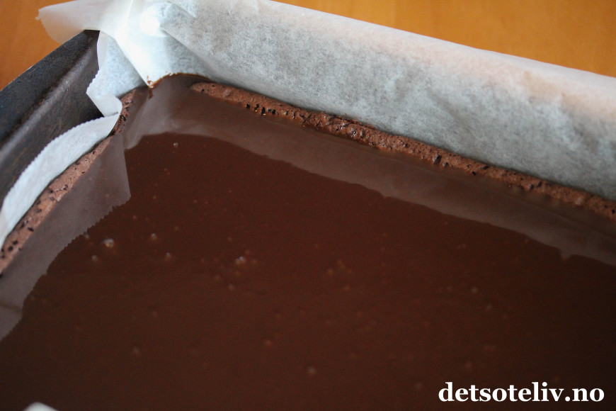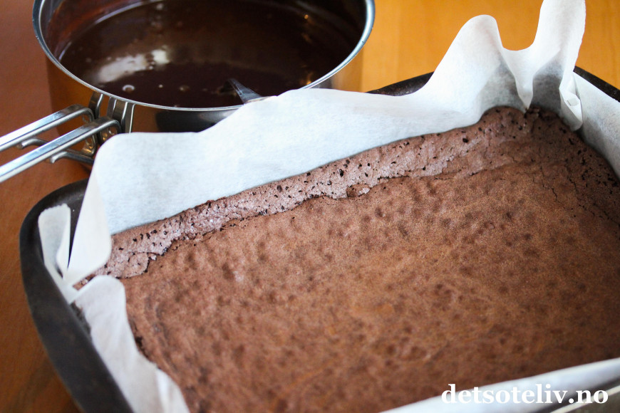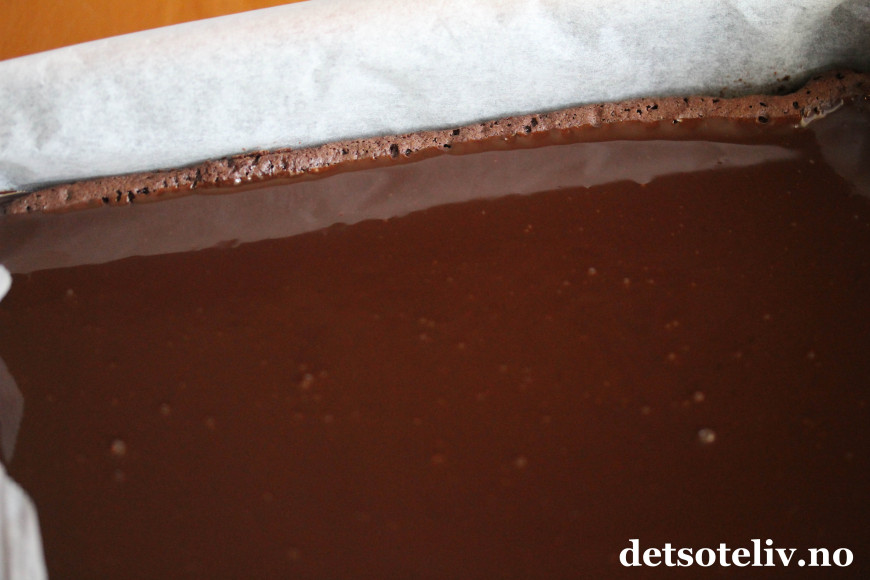 Ha deigen i en liten, bakepapirkledd langpanne (ca. 20 x 30 cm). Stek kaken midt i ovnen ved 160°C i 30-35 minutter. Kaken skal være litt bløt i midten. La kaken avkjøles i langpannen.