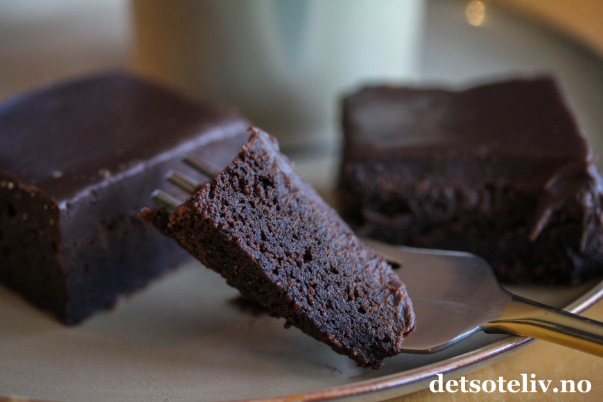 Kaken inneholder mye sukker som gir kaken en litt seig konsistens, som er utrolig digg - og helt fantastisk sammen med den bløte sjokoladeglasuren!!