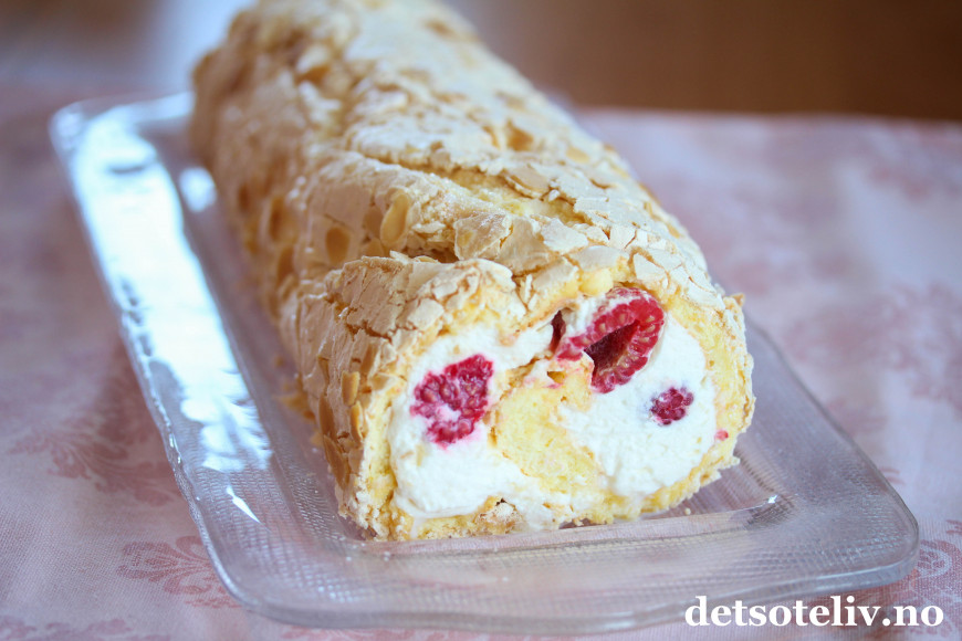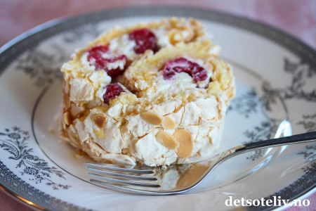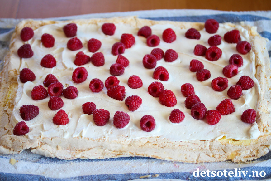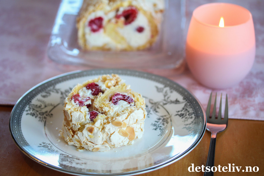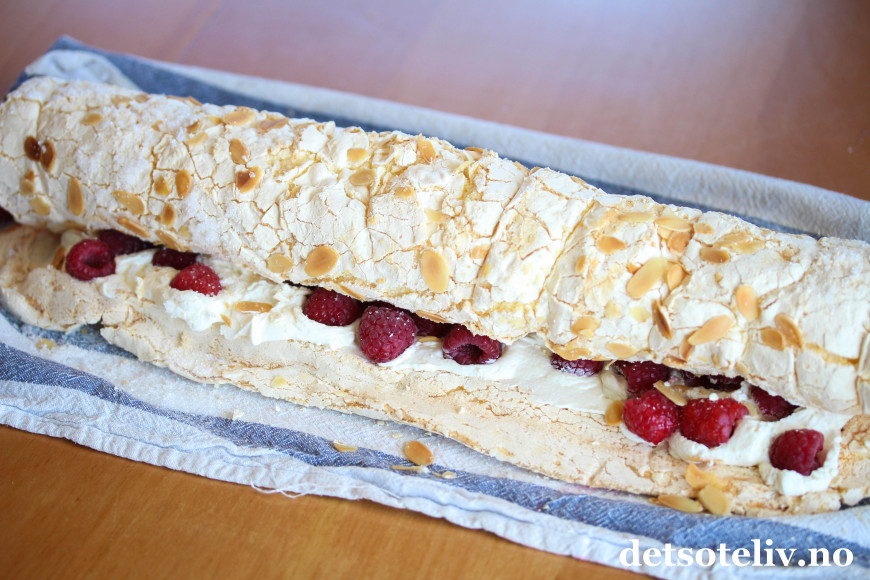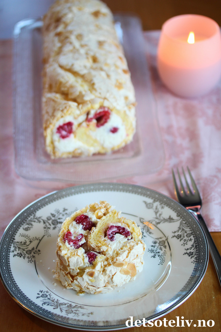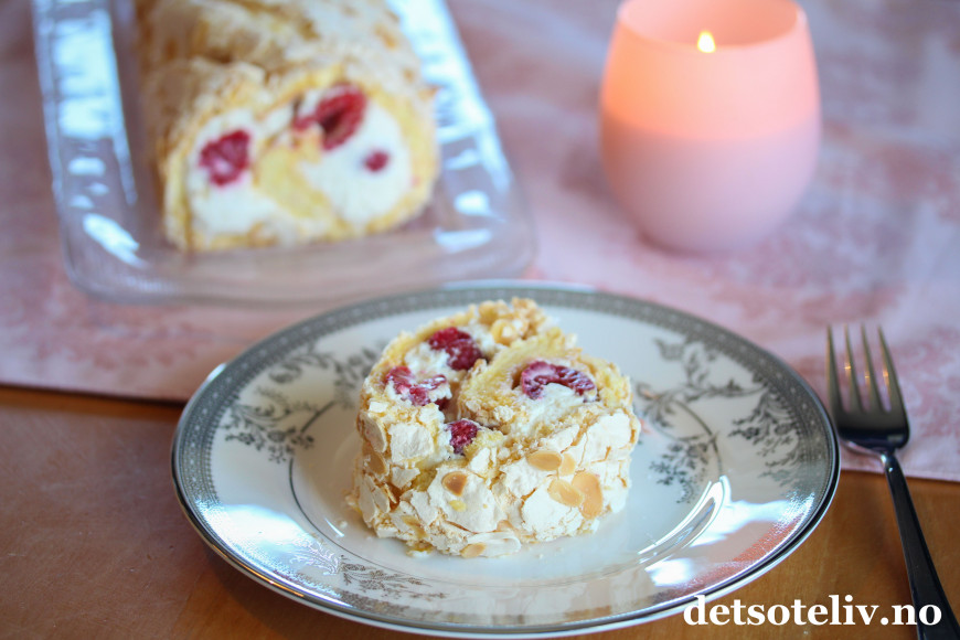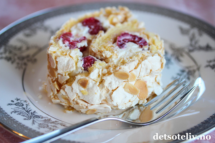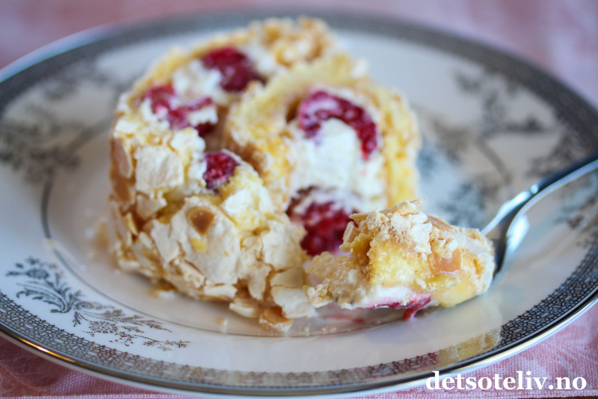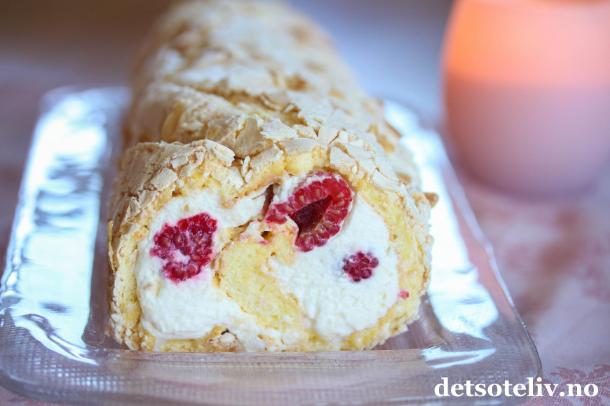 Friske bringebær smaker virkelig fantastisk godt i denne marengsrullekaken!