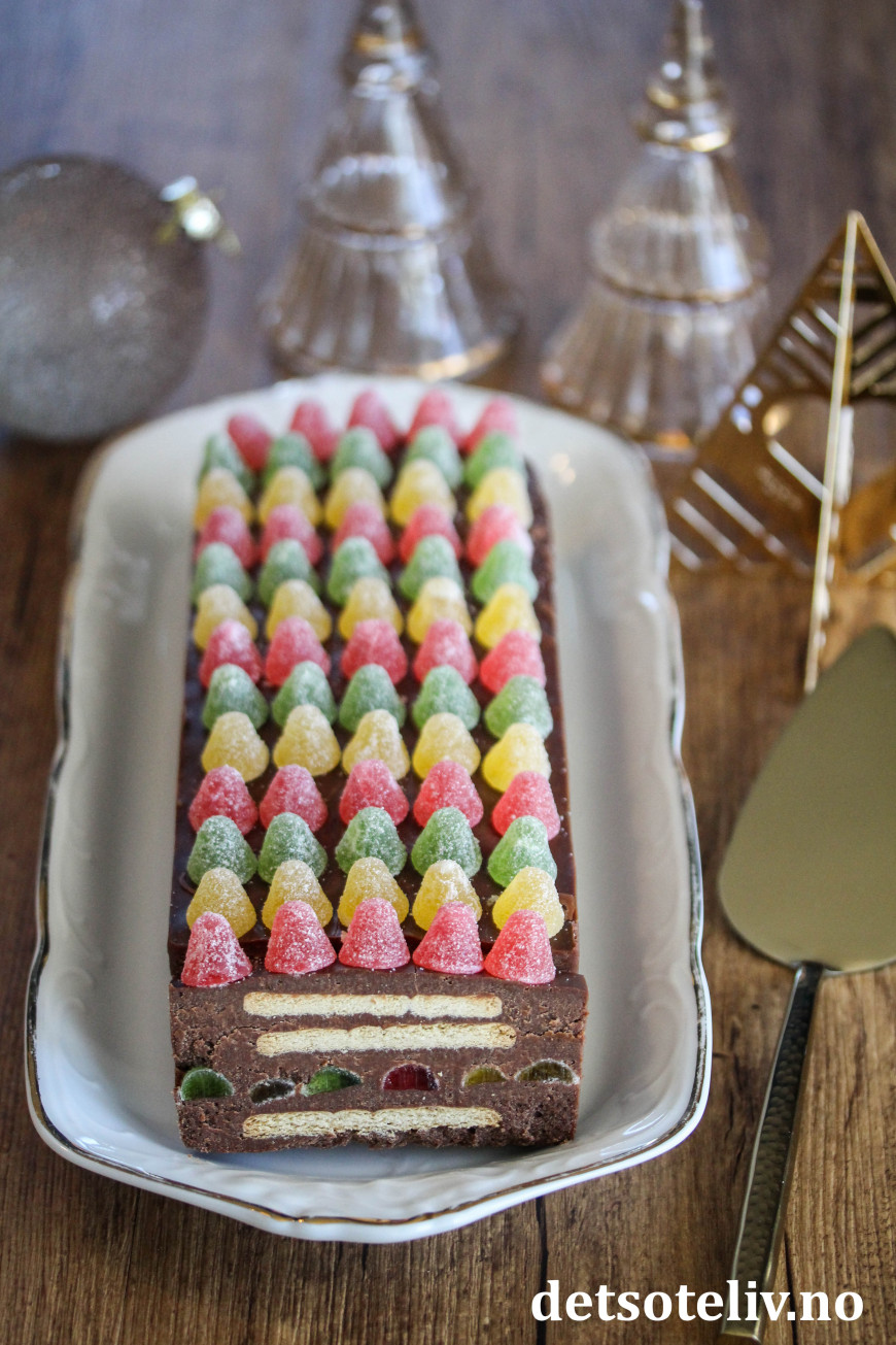 Kle en liten, smurt brødform som rommer 1 liter med bakepapir i bunn og kanter. Legg sjokolademasse, kjeks og gelétopper lagvis i formen. Begynn og avslutt med sjokolademassen. Pynt gjerne med masse gelétopper til slutt.