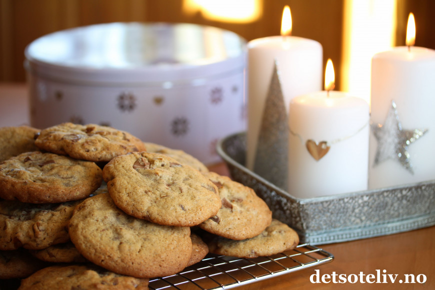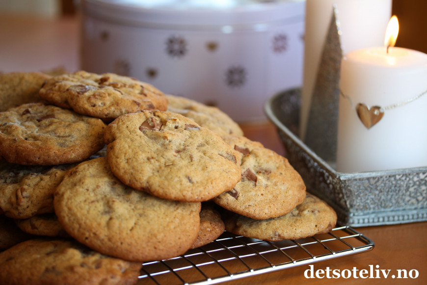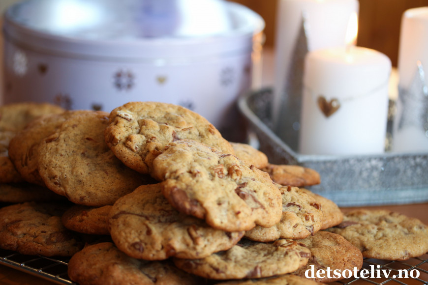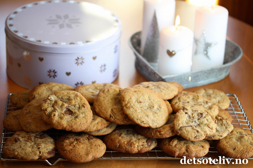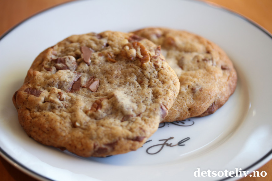 Cookiesene er av den myke, "chewy" typen og inneholder grovt hakkede pekannøtter og store biter melkesjokolade.