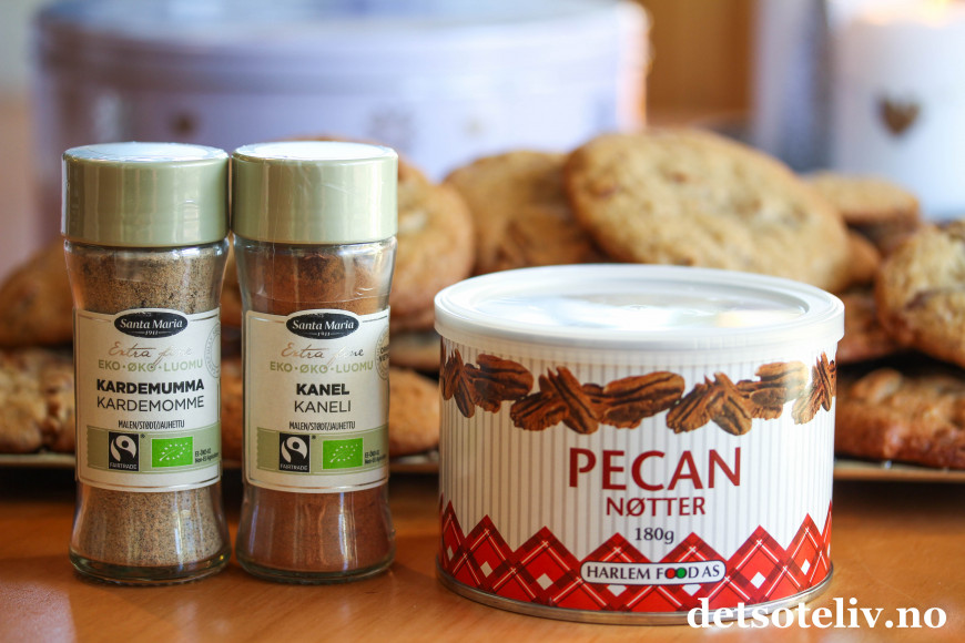 Rør mykt smør sammen med brunt og hvitt sukker til luftig smørkrem. Pisk inn sirupen og deretter eggene, ett om gangen. Pisk godt mellom hvert egg så smørkremen blir skikkelig luftig. Bland deretter inn kanel og kardemomme. Sikt mel og natron og ha i. Rør godt til du får en jevn deig. Bland i grovt hakkede pekannøtter og melkesjokoladebitene til slutt.