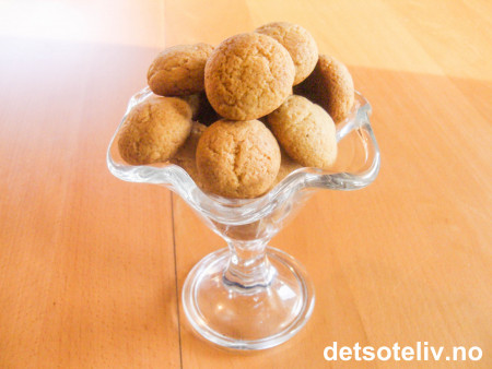Trill deigen ut til små kuler. Legg kakene på bakepapirdekkede stekeplater og stek dem midt i ovnen ved 175°C i ca 10-15 min. Avkjøles på rist.
