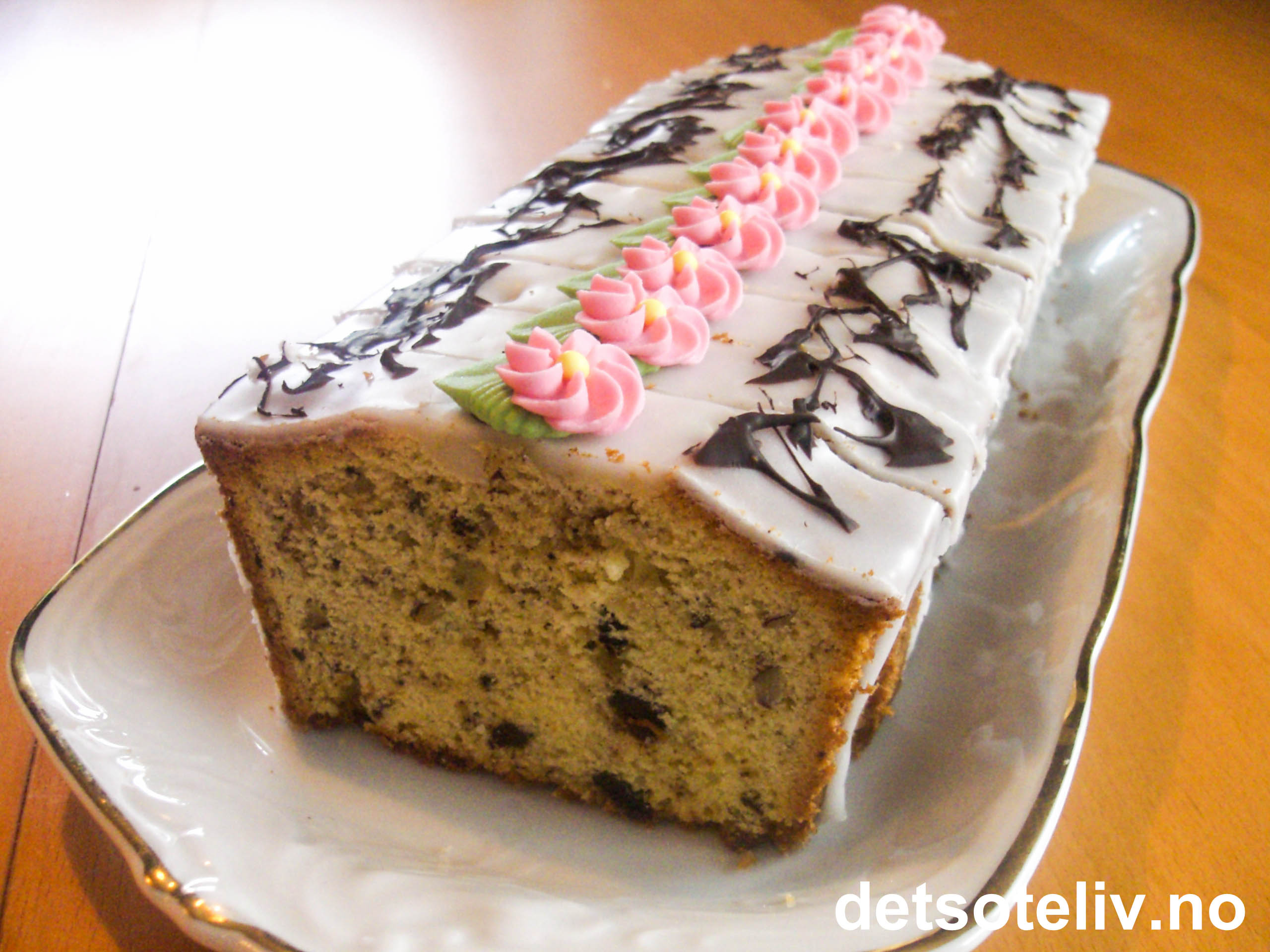 Ha deigen i en smurt brødform (1,5 liter) med bakepapir i bunnen. Jevn til overflaten. Stek kaken på rist nederst i ovnen ved 175°C i ca 1 time. Sjekk med en kakenål om kaken er helt gjennomstekt i midten.
