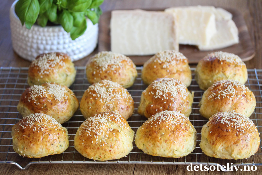 Verken parmesanosten eller urtene er spesielt synlige i de ferdige rundstykkene, men de gjør sitt til at rundstykkene blir ekstra gode.