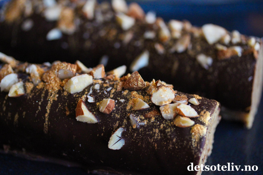 Du får lekre marsipanbrød hvis du pensler dem med smeltet sjokolade og drysser over hakkede mandler og gullstøv.