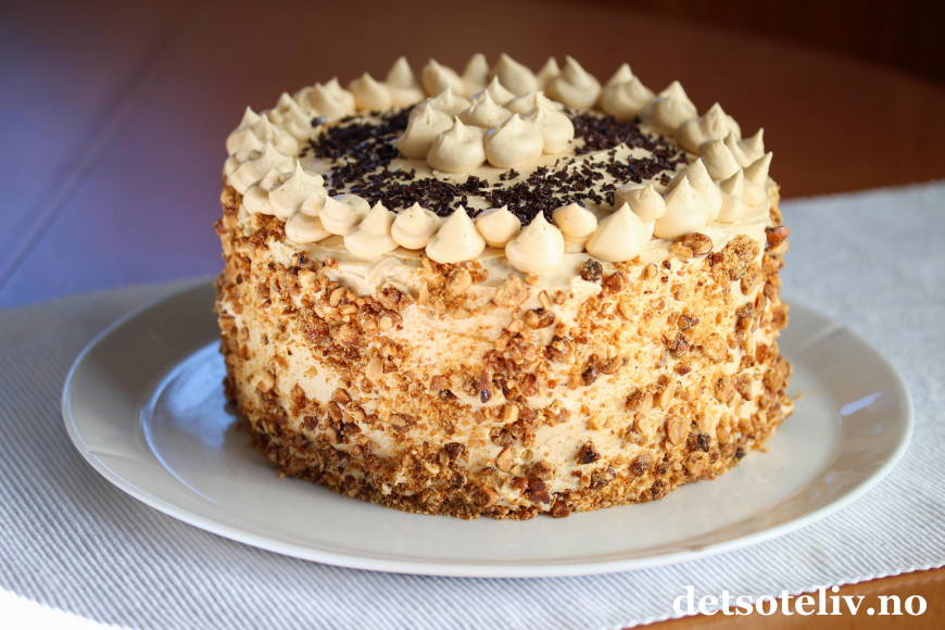 I tillegg til karamellkremen, bruker jeg hjemmelaget peanøttkrokan i fyllet, som gir en herlig krønsj til den ellers myke kaken.