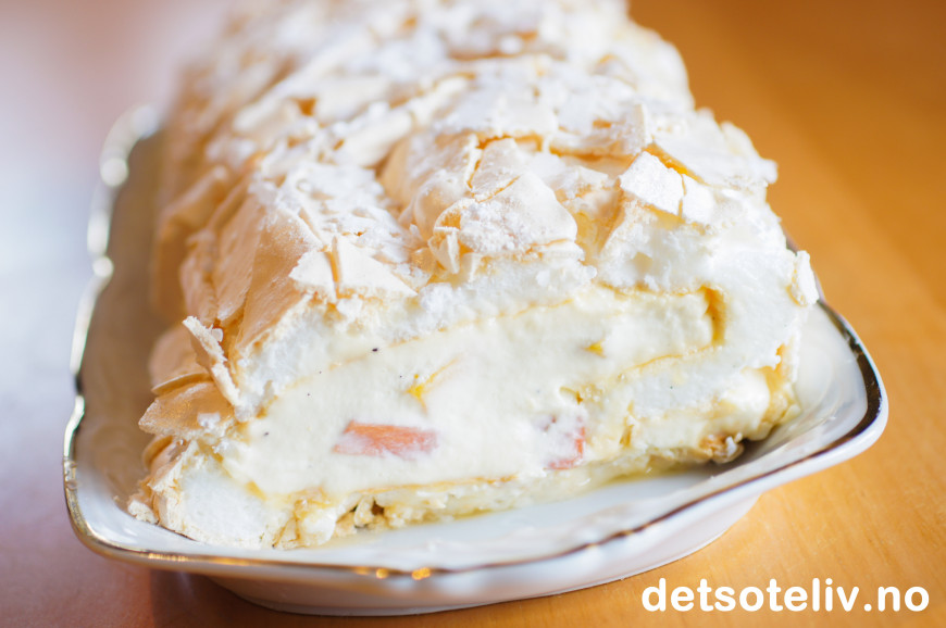 Bre marengsen utover i en stor, bakepapirkledd langpanne (ca 30 x 40 cm). Stek marengsen midt i ovnen ved 160 °C i ca 20-25 min. Den skal da være fast på oversiden, men fortsatt helt hvit i fargen. Ta langpannen ut av ovnen og hvelv kaken forsiktig ut på et bakepapir som er drysset med melis. La marengsbunnen avkjøles med den varme langpannen over (se tips).