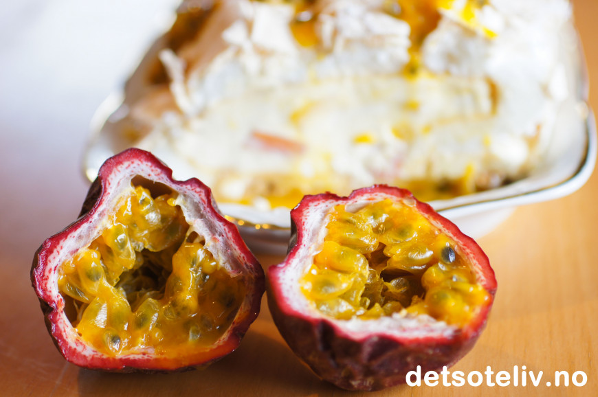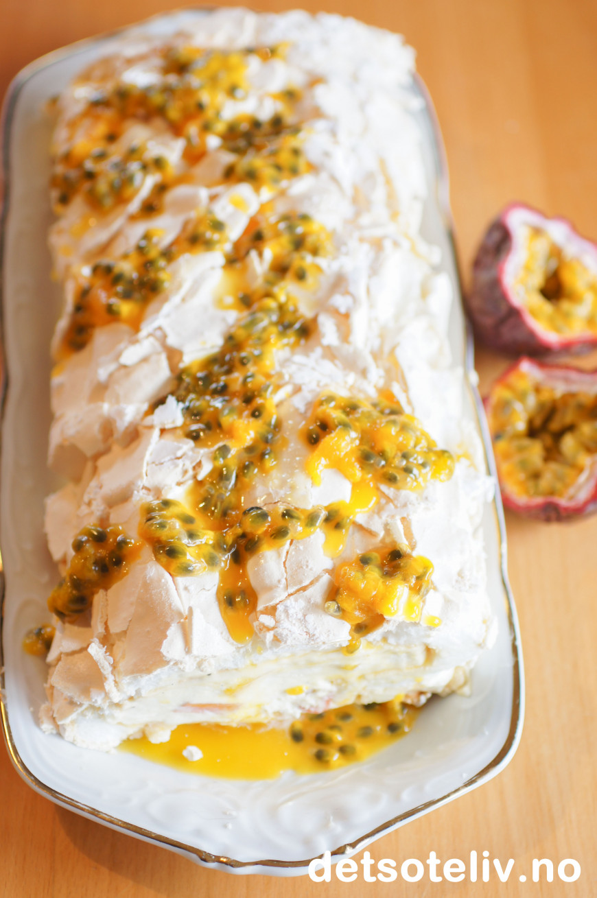 Rett før servering skrapes fruktkjøttet ut av pasjonsfruktene. Bland fruktkjøttet med melis til passe søthet. Fordel ca halvparten av pasjonsfruktsausen over marengsrullen. Resten av pasjonsfruktsausen serveres ved siden av.