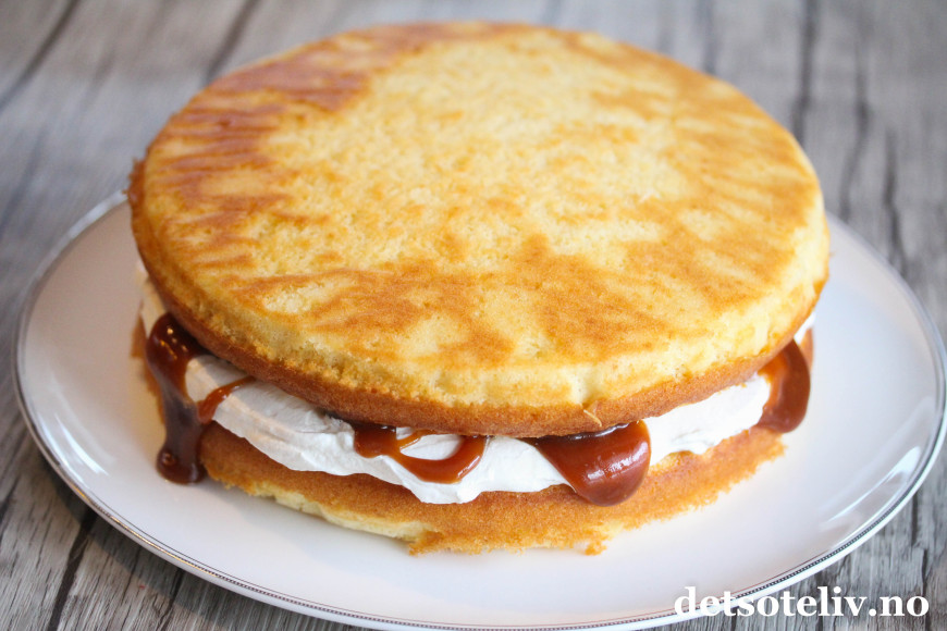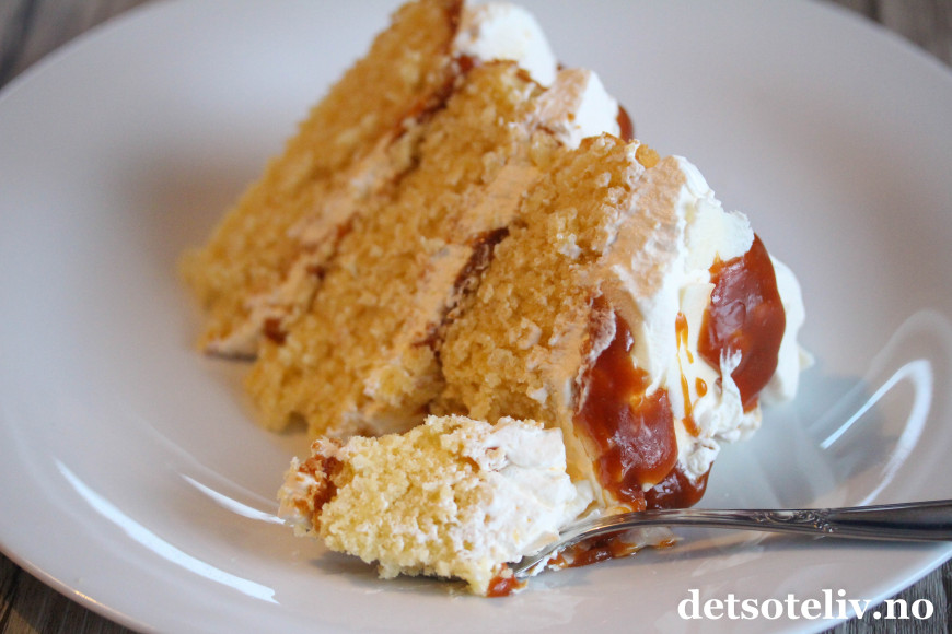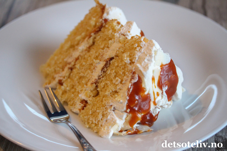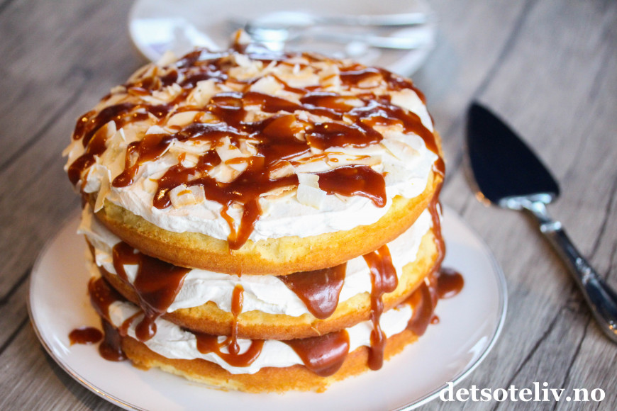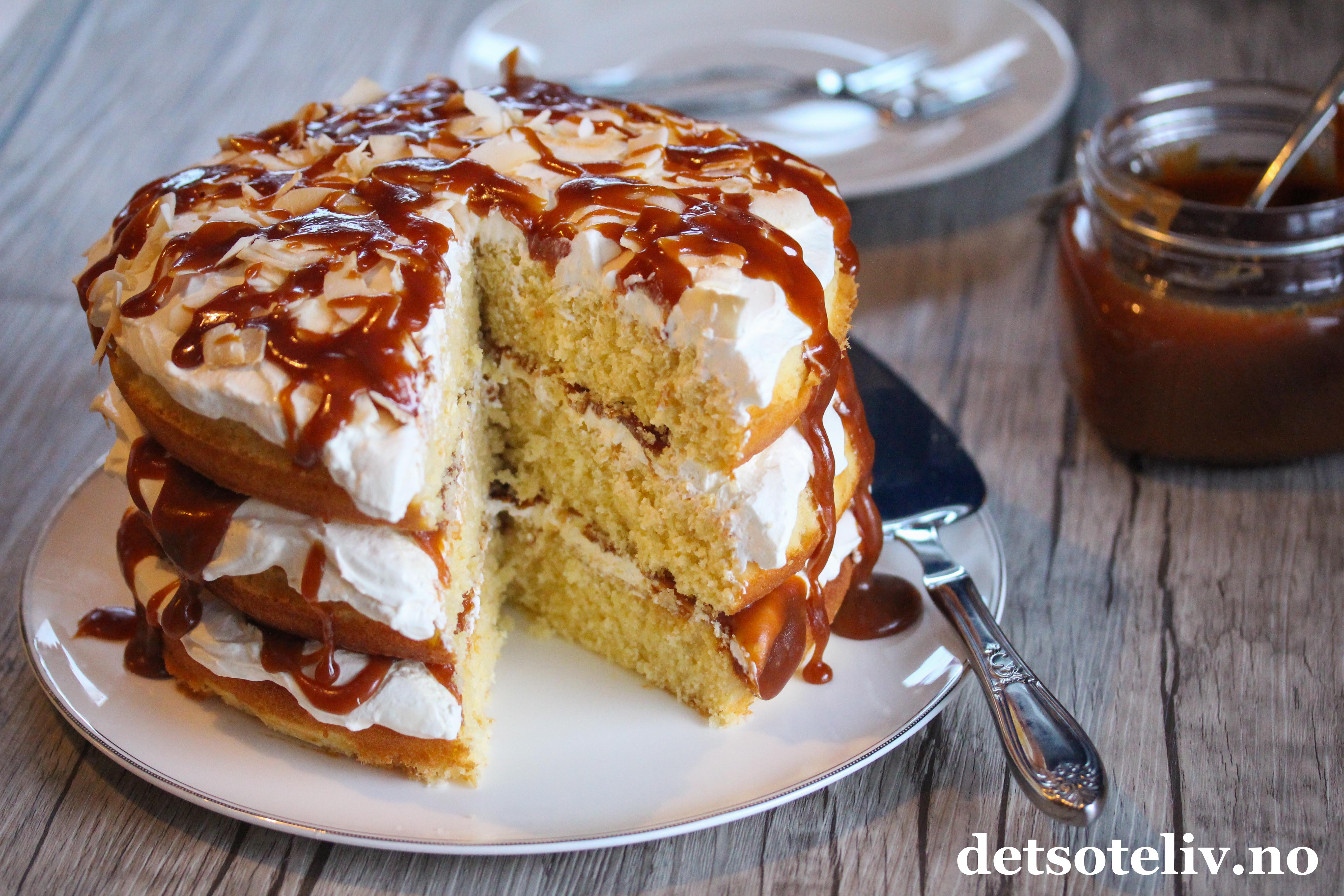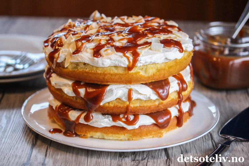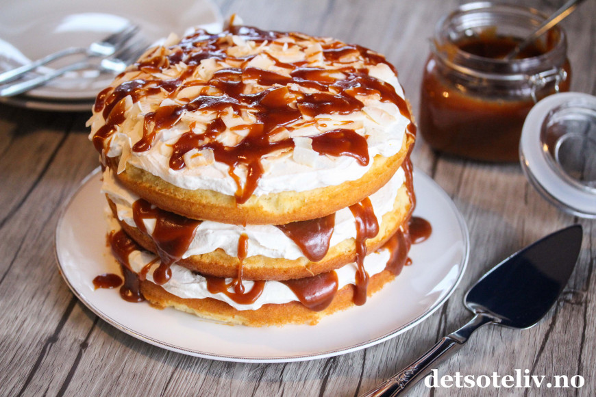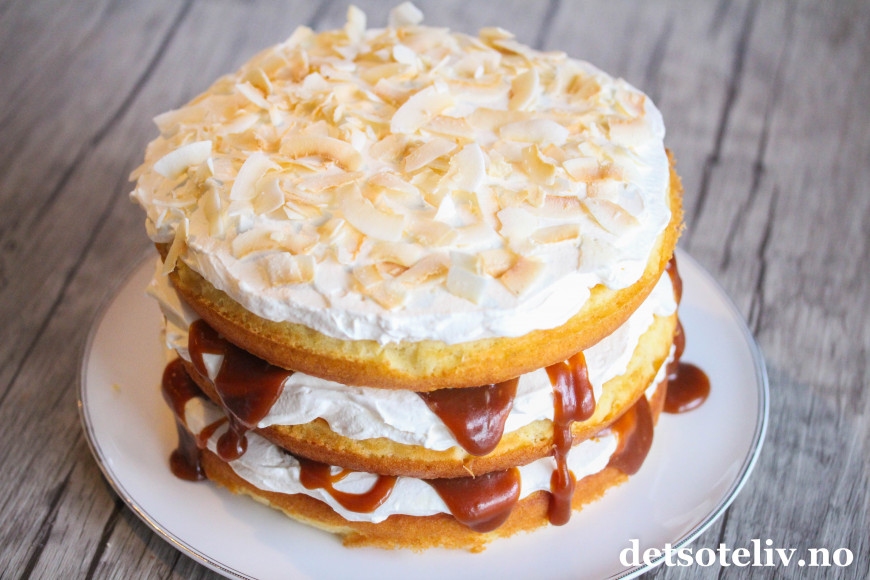 Dette er en nydelig kake bestående av myke kokoskakebunner, som settes sammen med en lett syrlig crème fraîche-krem og tykk, søt karamellsaus.