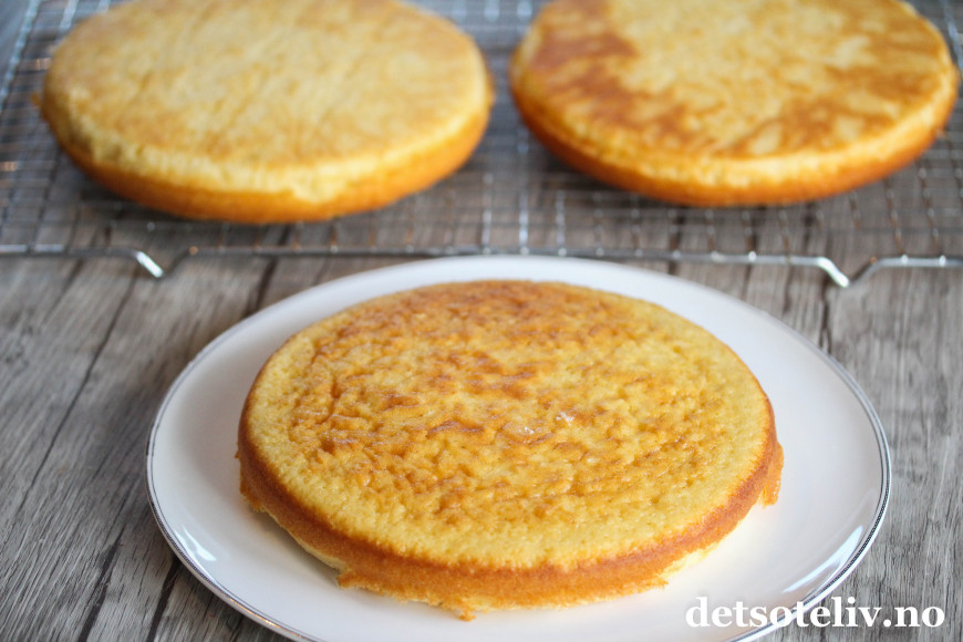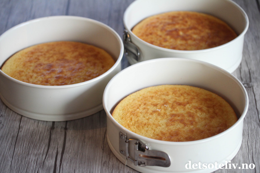Fordel deigen i 3 runde former (22 cm i diameter). Hvis du ikke har 3 like store former, går det fint å steke en kakebunn av gangen. Stek kakene på rist midt i ovnen ved 180°C i 20-25 minutter. Avkjøl kakebunnene til de er helt kalde.
