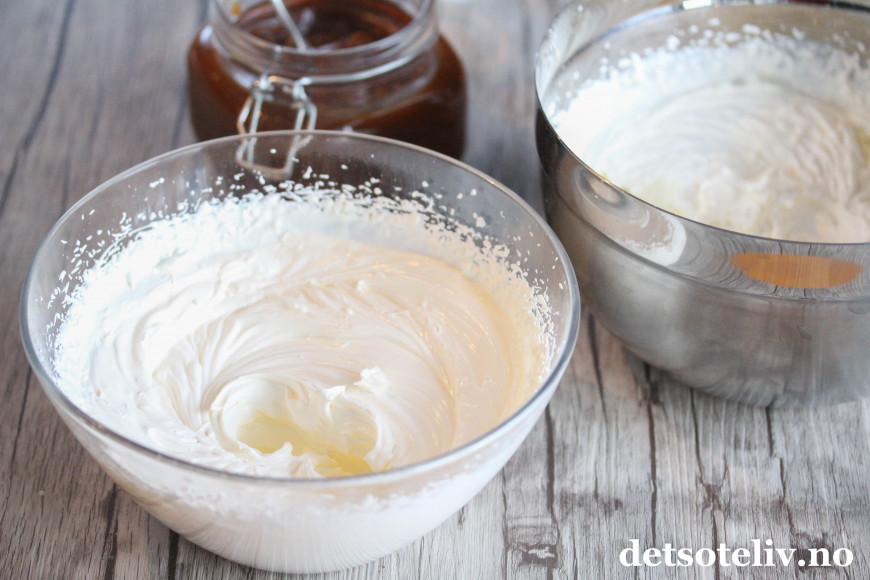 I en annen bolle piskes crème fraîche til en tykk krem (den blir like stiv som pisket kremfløten, men det tar litt lenger tid enn med kremfløten, ca. 10 minutter med elektrisk mikser).
