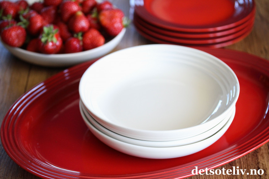 Det flotte serviset fra Le Creuset er i fargene rødt (fargen heter "cerise") og hvitt (fargen heter "creme").