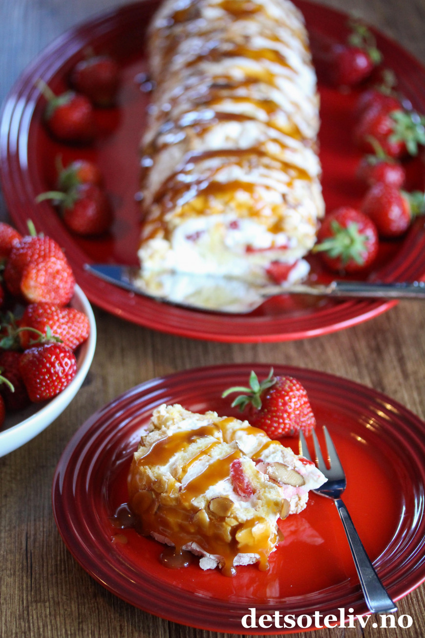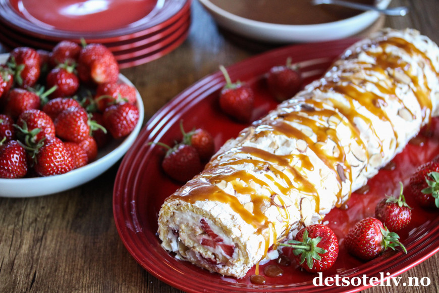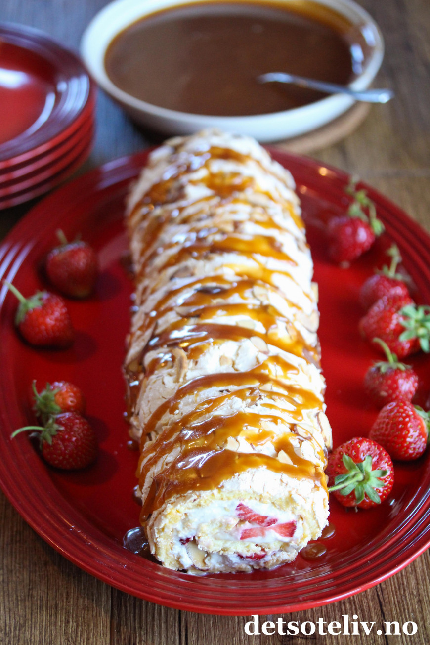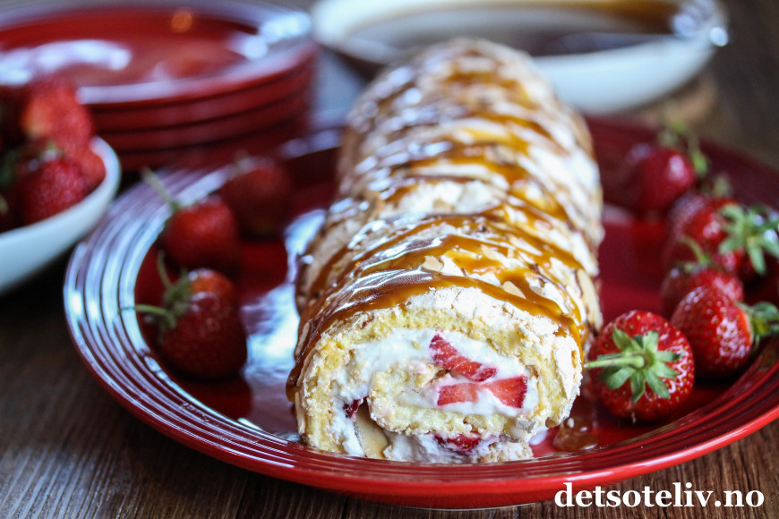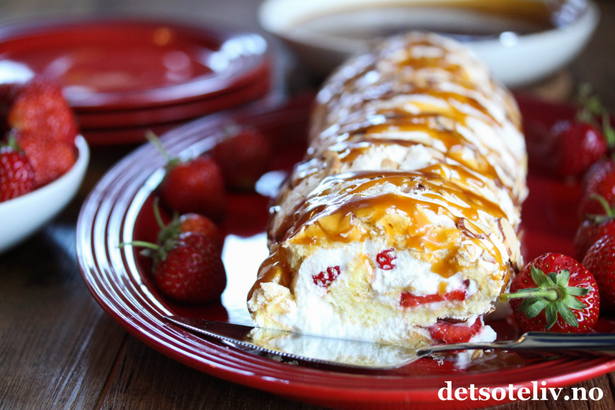 Denne rullekaken består av bløt vaniljemarengs, fløtekrem, søte jordbær og deilig karamell og er EN DRØM AV EN KAKE!