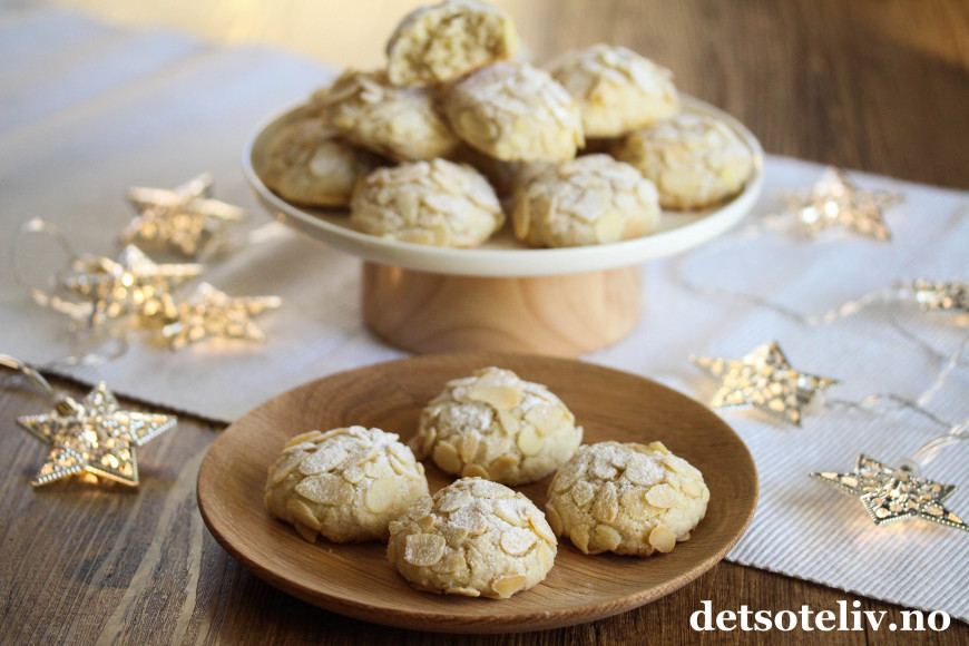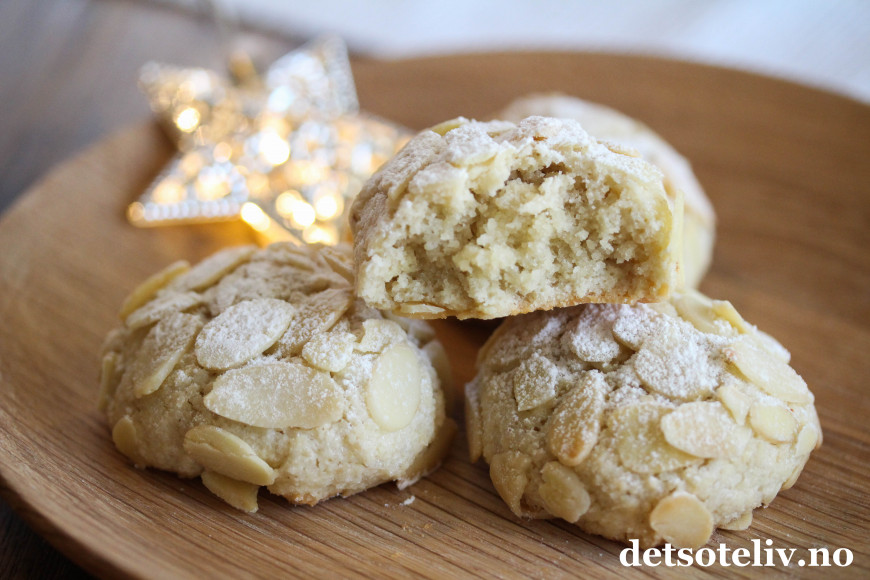 Italienske biscotti forbinder du kanskje mest med de berømte, harde kjeksene som er så fine å dyppe i kaffen, men ordet "biscotti" brukes i Italia også generelt om alle slags varianter "kjeks". Dette her er italiensk mandelkjeks av den myke sorten. De lages med skåldede mandler, rulles i mandelflak og drysses med melis etter steking.